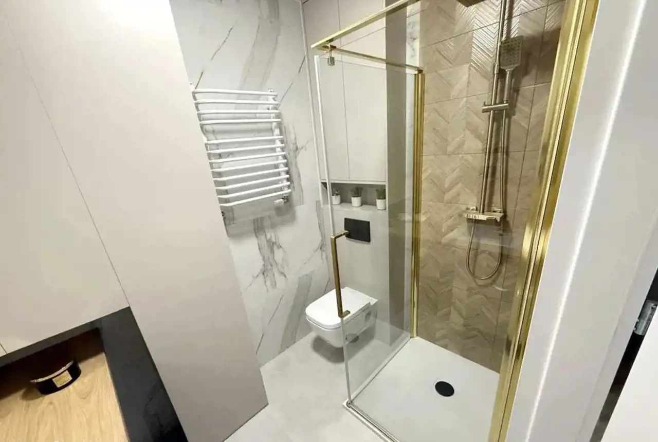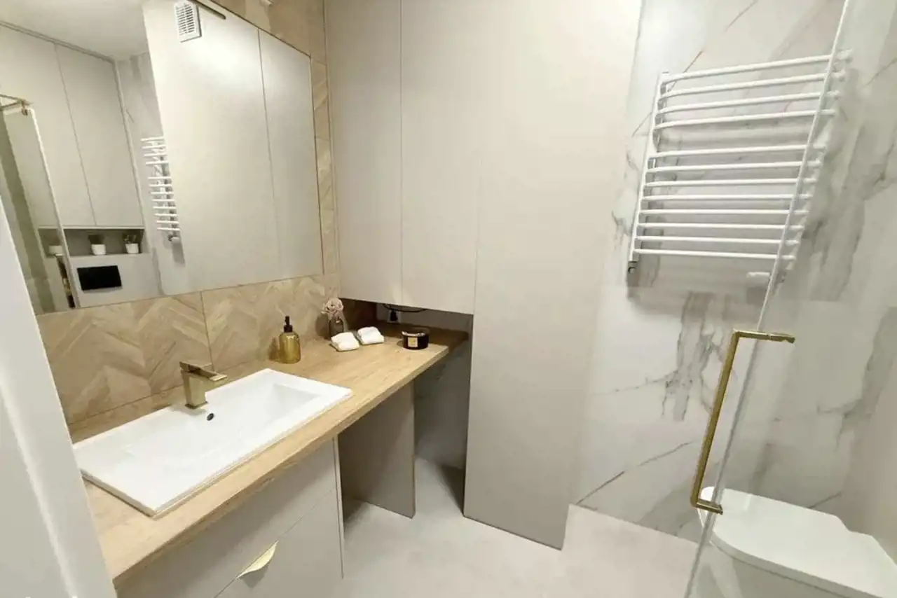 Łazienka: Ściany i podłoga zostały wykończone płytami gresowymi wysokiej jakości, dodatkowo łazienka została wyposażona w zabudowę łazienkową , nowoczesną z elementami szykownego złota kabinę prysznicową z cichym domykiem. W przypadku WC zastosowano zestaw podtynkowy ze stelażem podtynkowym firmy GEBERIT. Nad umywalką zamontowano duże lustro dzięki czemu udało się uzyskać optyczne powiększenie przestrzeni.