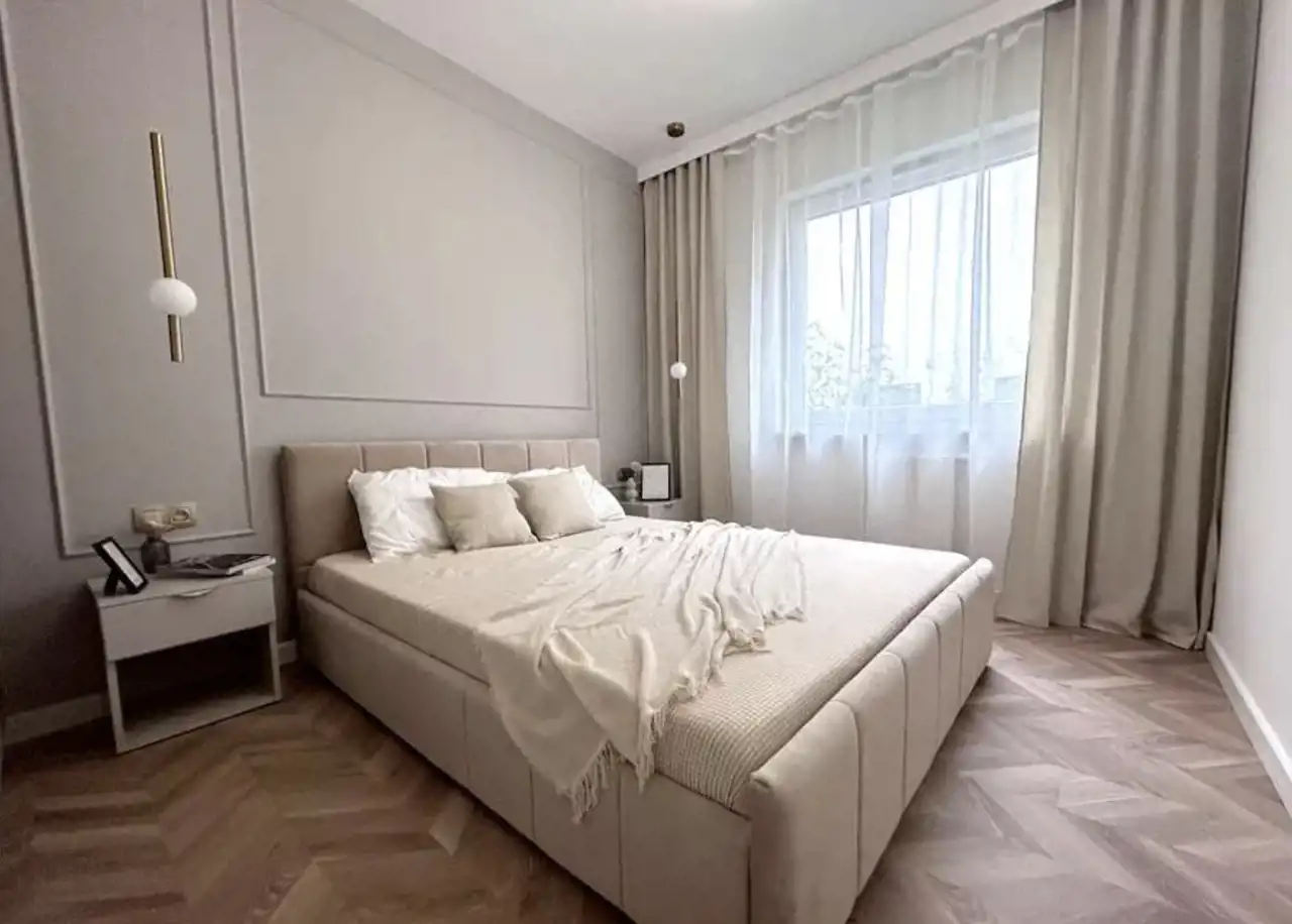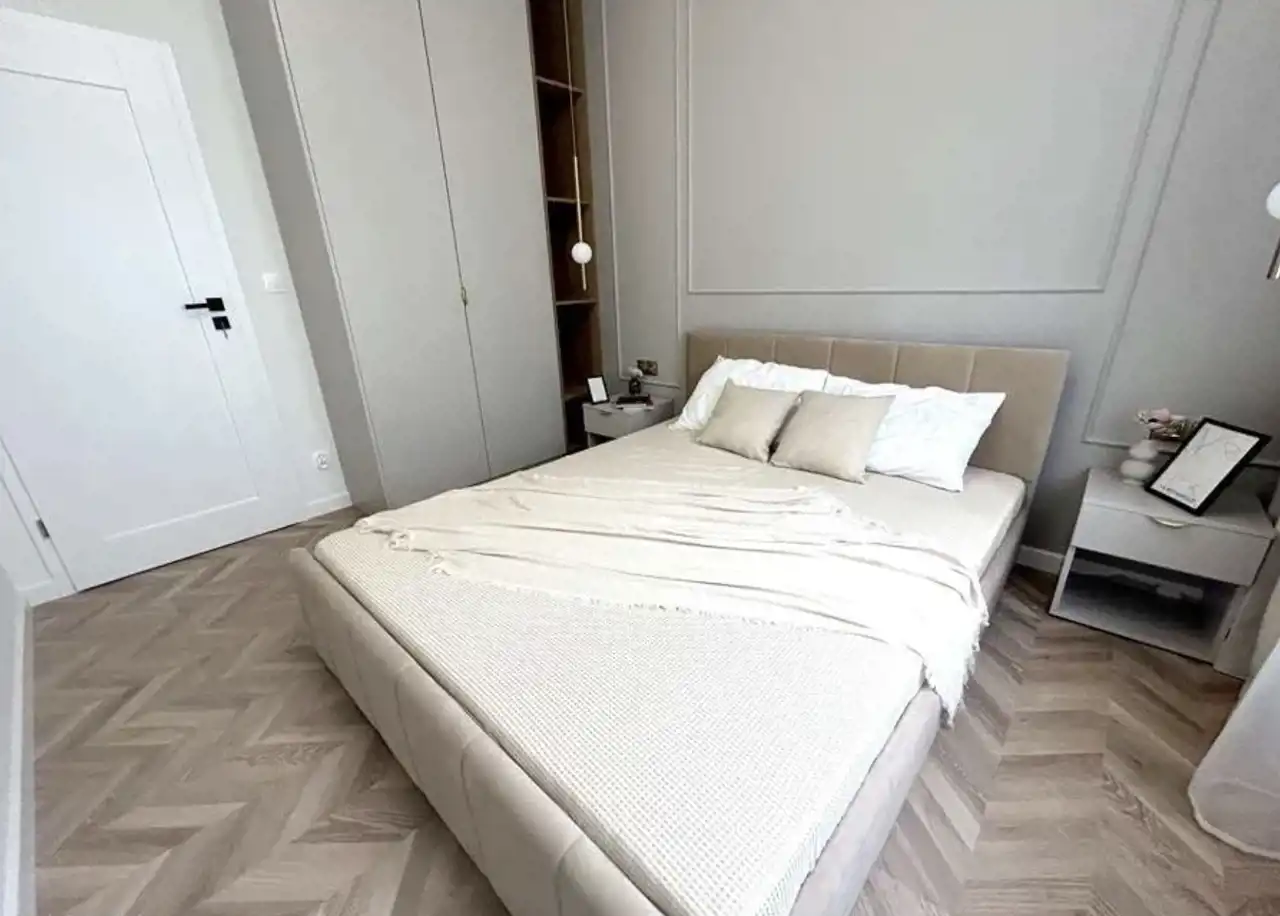 Sypialnia: Sztukateria na ścianie, szafa w zabudowie, łóżko sypialniane wraz z materacem oraz szafki nocne zostały wykonane w kolorze pozostałych pomieszczeń apartamentu, aby tworzyć razem wyjątkowo spójną przestrzeń. Sypialnia została urządzona w taki sposób, aby czuć się w niej przytulnie i móc się jak najszybciej zrelaksować po całym dniu pracy.