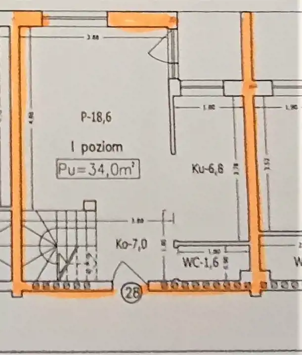 - na pierwszym poziomie pokój dzienny z wydzieloną kuchnią o łącznej powierzchni 34m2