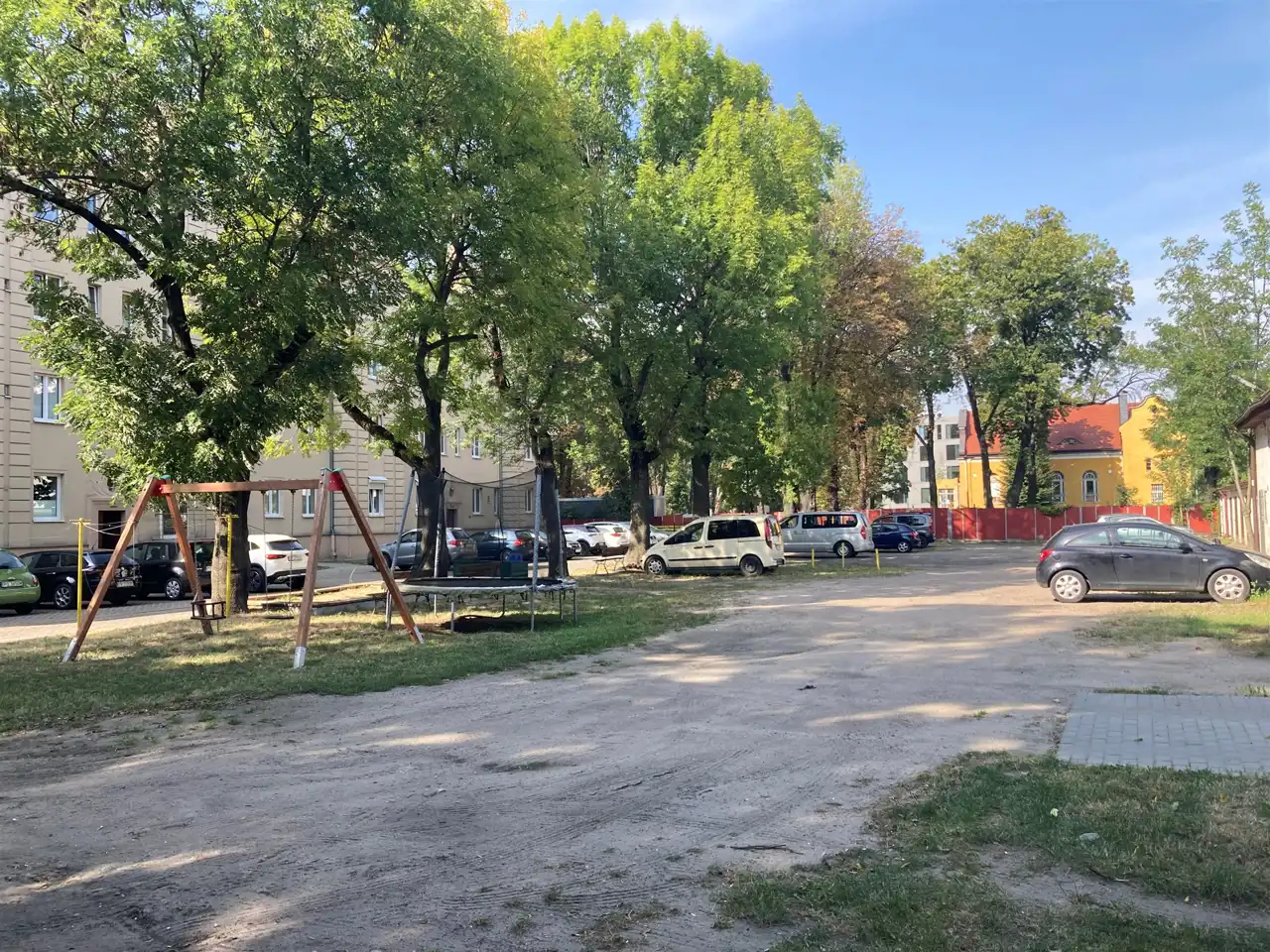 duże, ogrodzone i zadbane podwórko z kasztanowcami, zielenią i piaskownicą