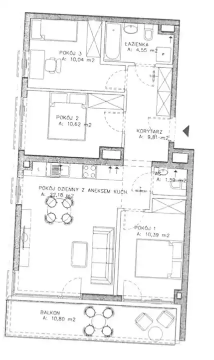 - według księgi wieczystej lokal składa się z: pokój dzienny z aneksem kuchennym - 1, pokój - 3, łazienka - 1, korytarz - 1, wc – 1,