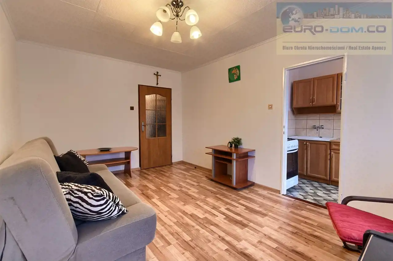 Niecałe 44m2 w skład, którego wchodzą: pokój z balkonem, drugi pokój, z którego mamy dostęp do kuchni, łazienka i korytarz. Mieszkanie znajduje się na trzecim piętrze w cztero-piętrowym bloku. Jest wyposażone w podstawowe sprzęty: pralka, lodówka, kuchenka gazowa.