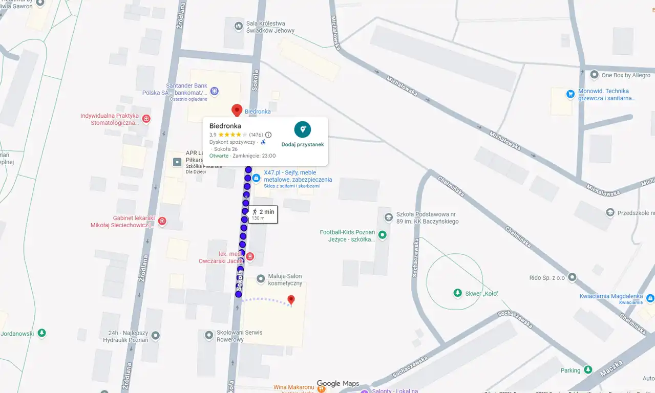 W pobliżu dostępne są różnorodne sklepy spożywcze, takie jak Żabka, Biedronka (130 m), Lidl oraz Chata Polska, zapewniając wygodę na co dzień.