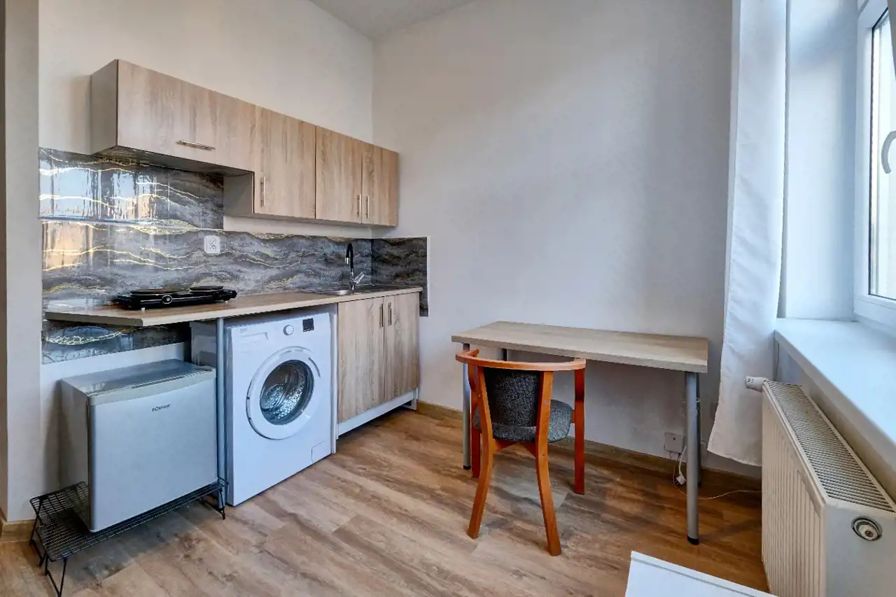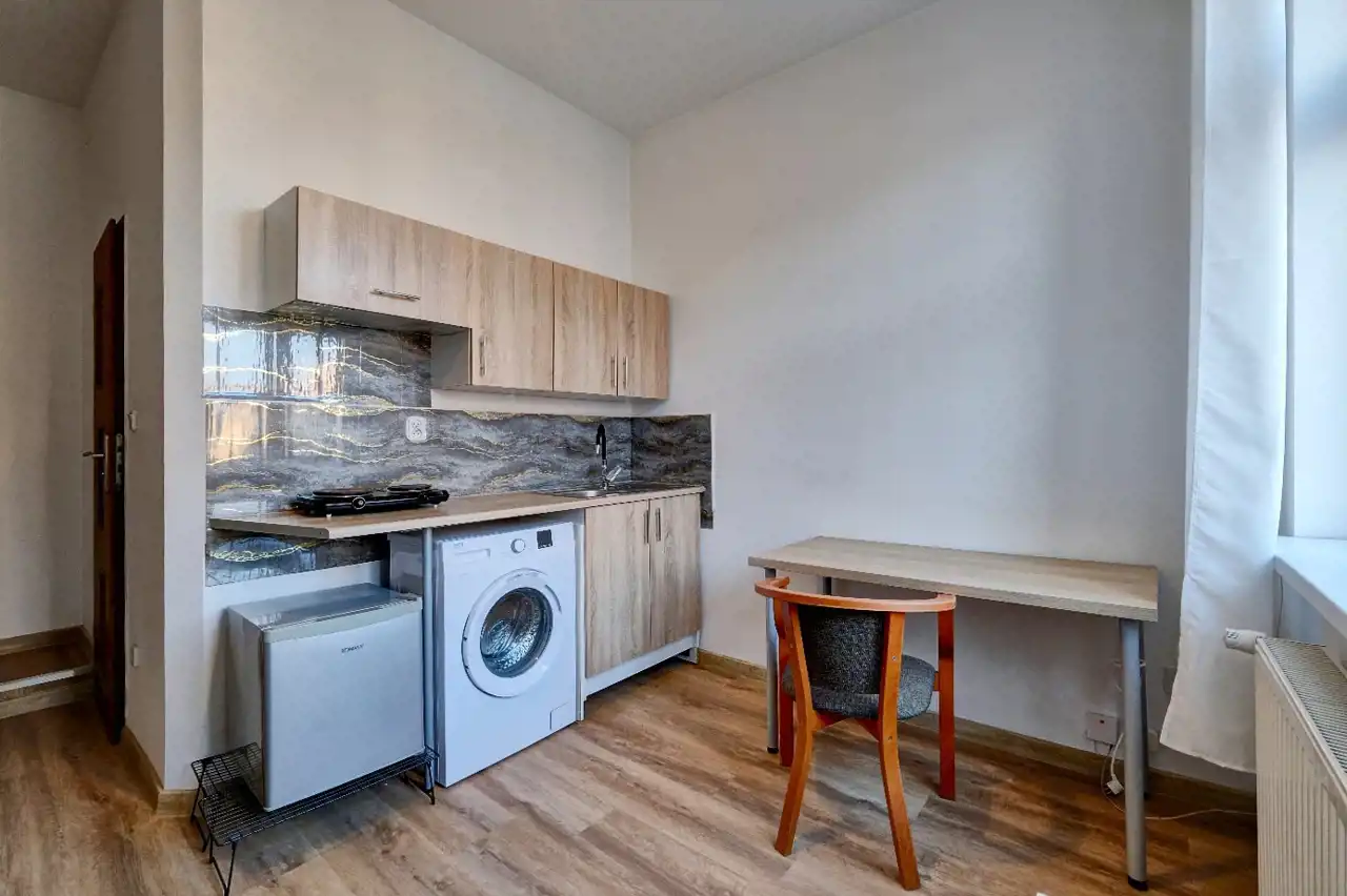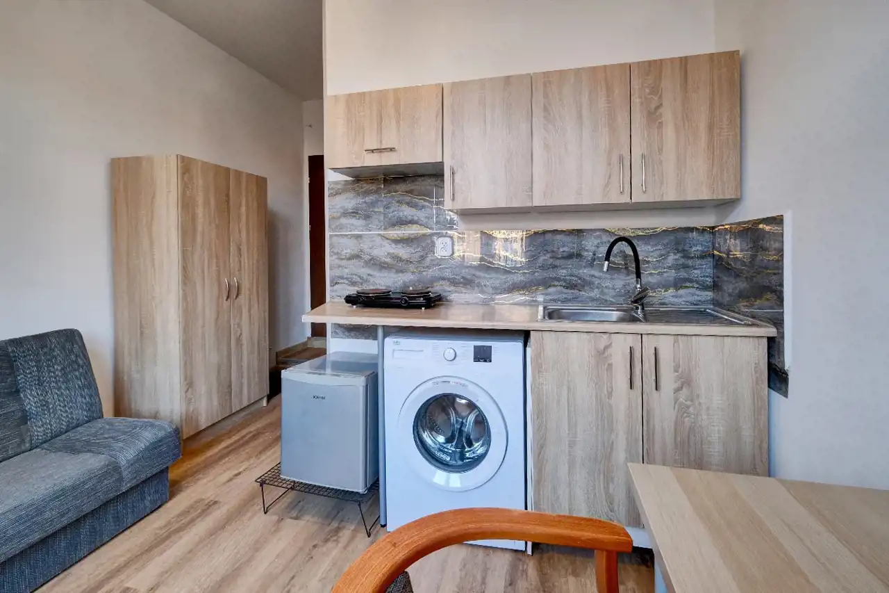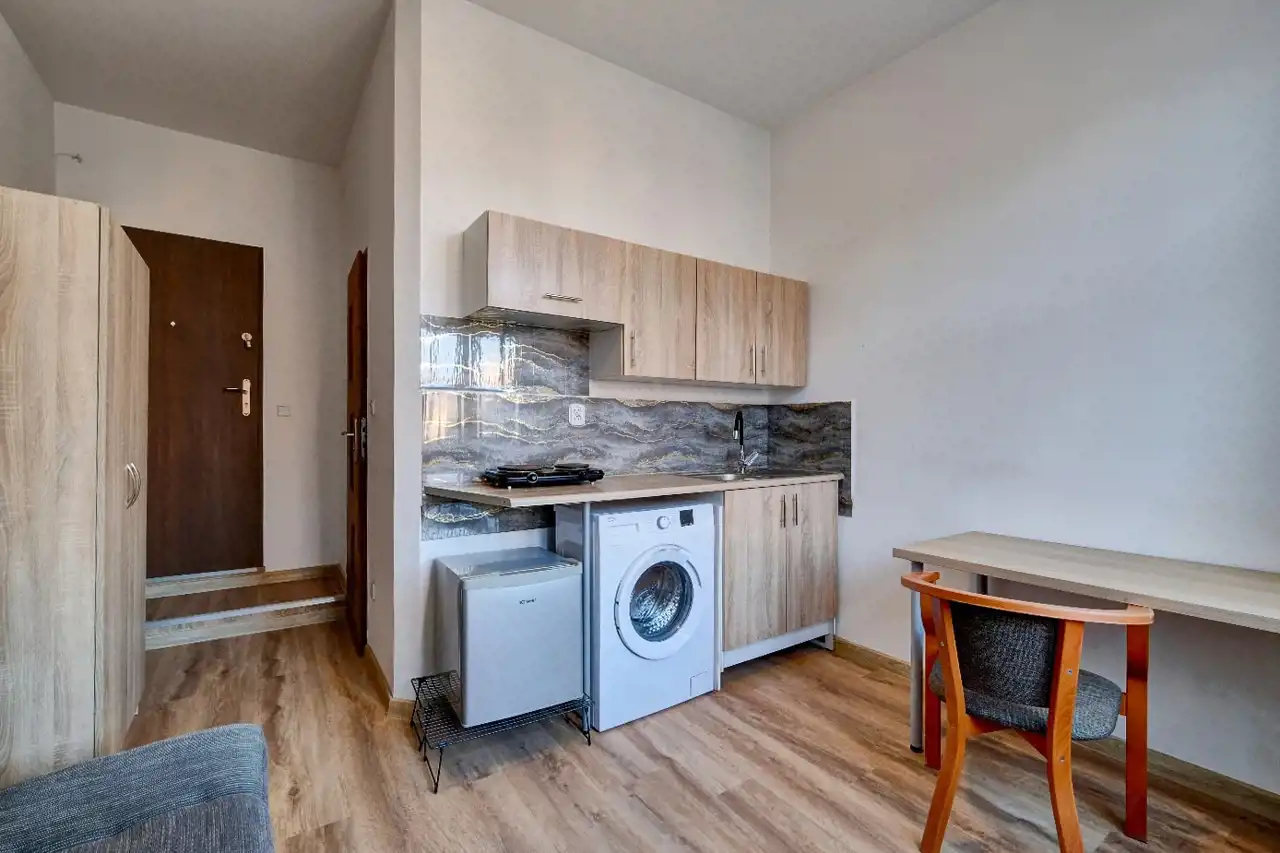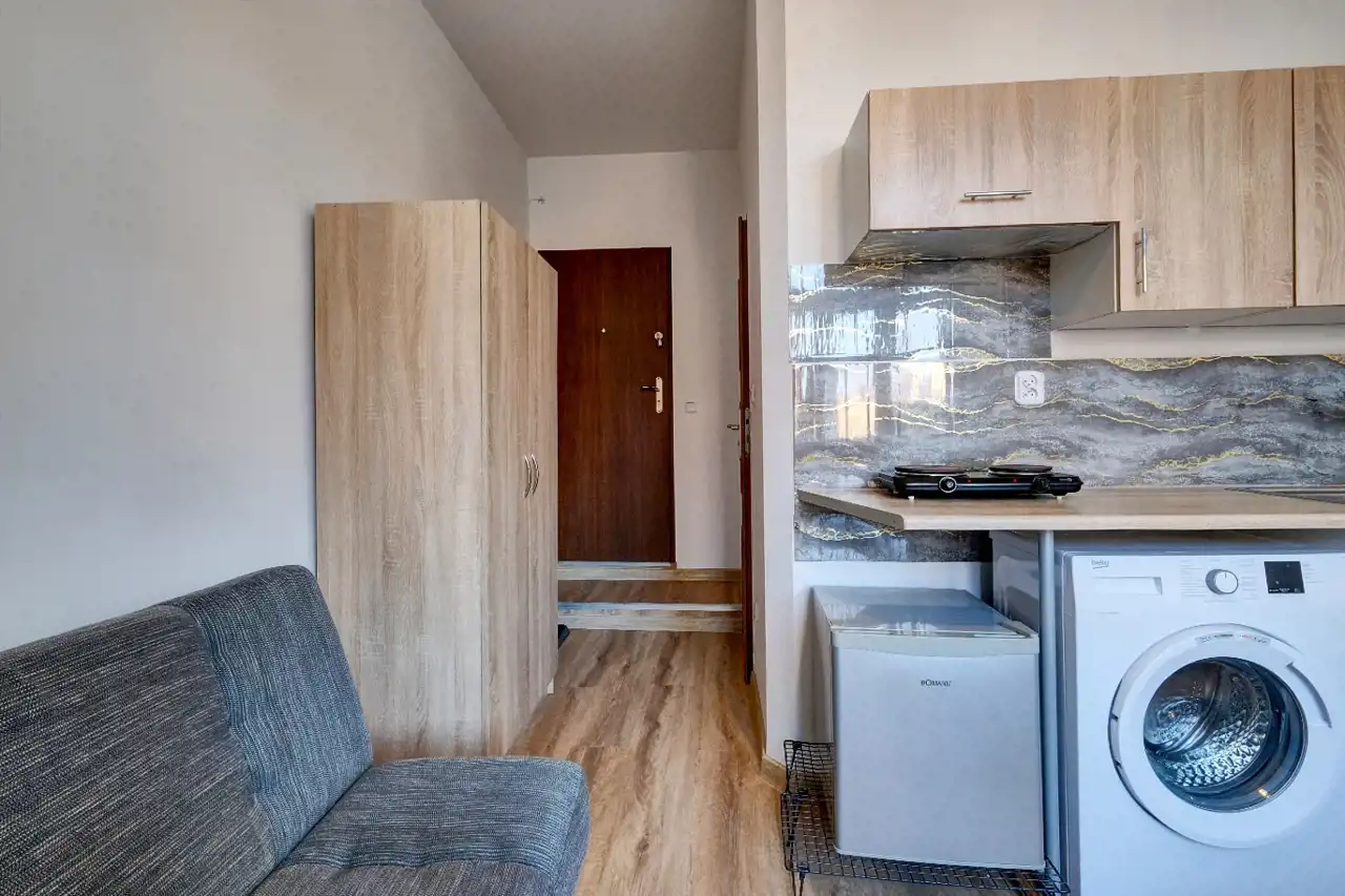 Kuchnia w aneksie, pralka i lodówka na wyposażeniu w pokoju z aneksem kuchennym (możliwość wstawienia większej lodówki).
