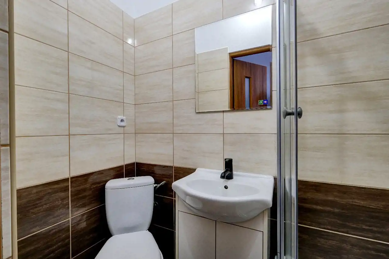 Mieszkanie składa się z pokoju o powierzchni ok. 9,2 m2, łazienki 1,8 m2, korytarza 2,9 m2