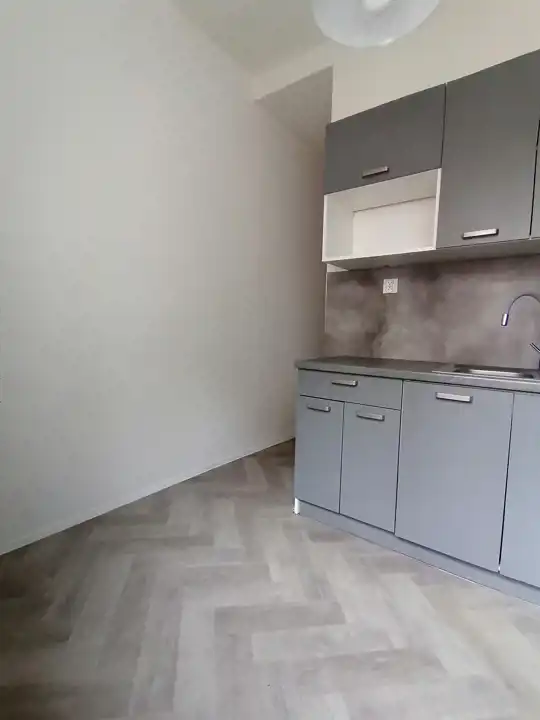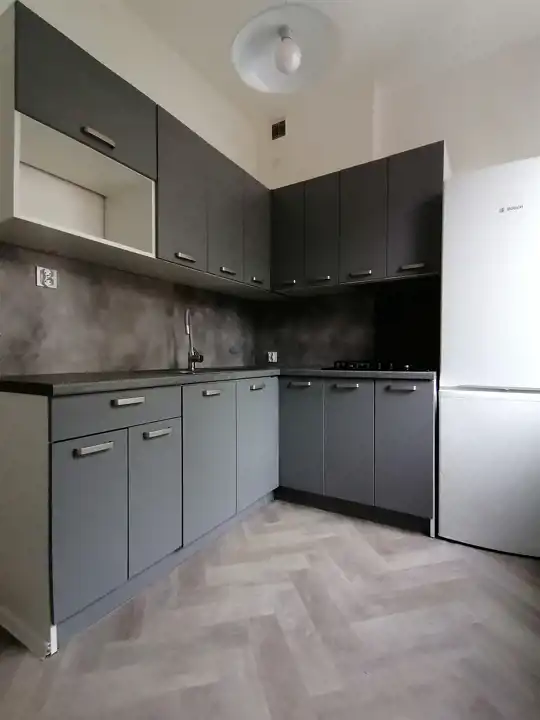 W mieszkaniu znajduje się zabudowa kuchenna z wyposażeniem (lodówka, płyta gazowa, pralka).