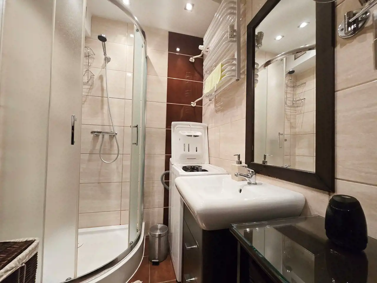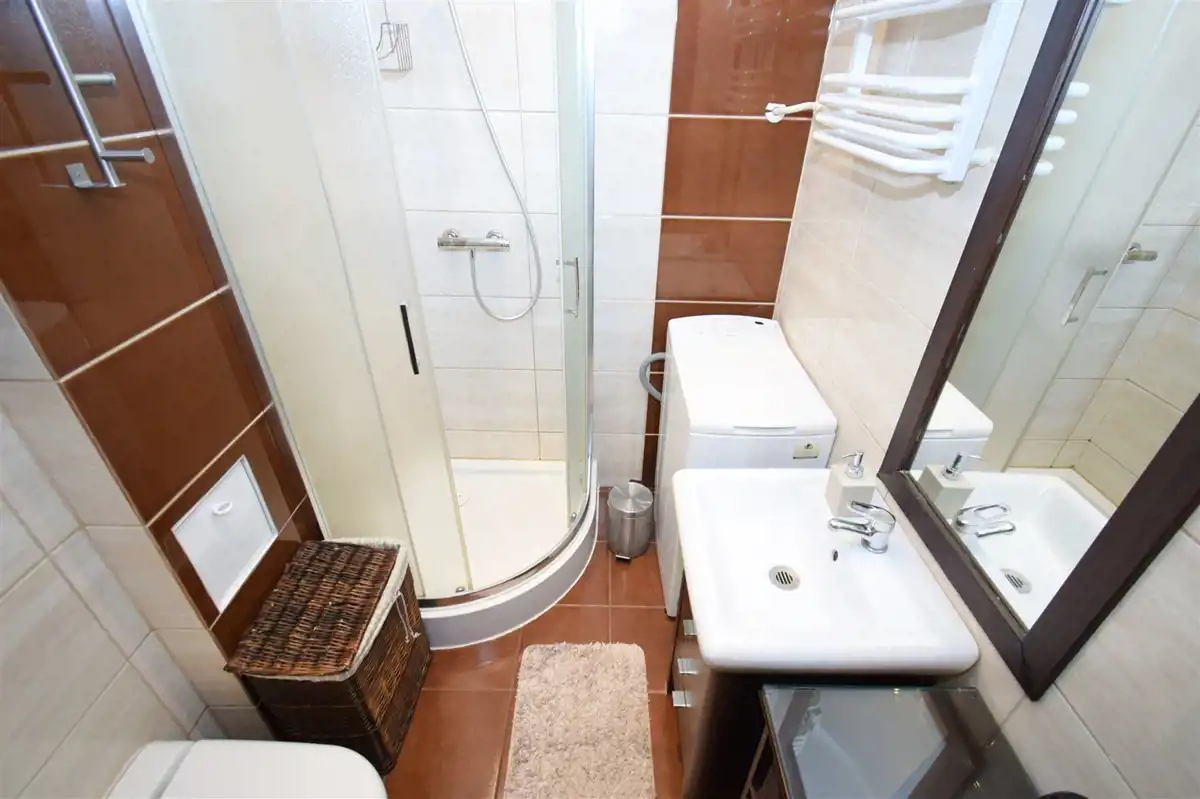 W łazience znajduje się kabina prysznica, umywalka, szafka, toaleta, pralka.