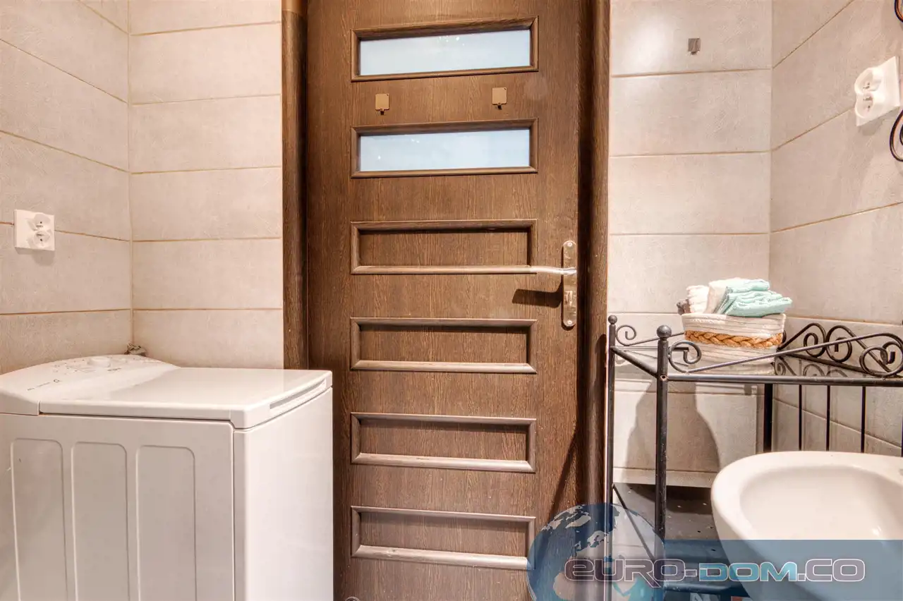 Łazienka posiada prysznic , lustro, pralkę, umywalkę oraz sedes.