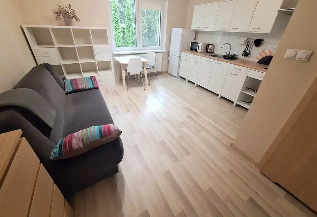 Umeblowane i wyposażone w sprzęty AGD (pralka, mikrofalówka, płyta grzewcza indukcyjna (dwupunktowa), czajnik, lodówka z zamrażalnikiem, wyposażenie drobne (garnki, naczynia, sztućce).
