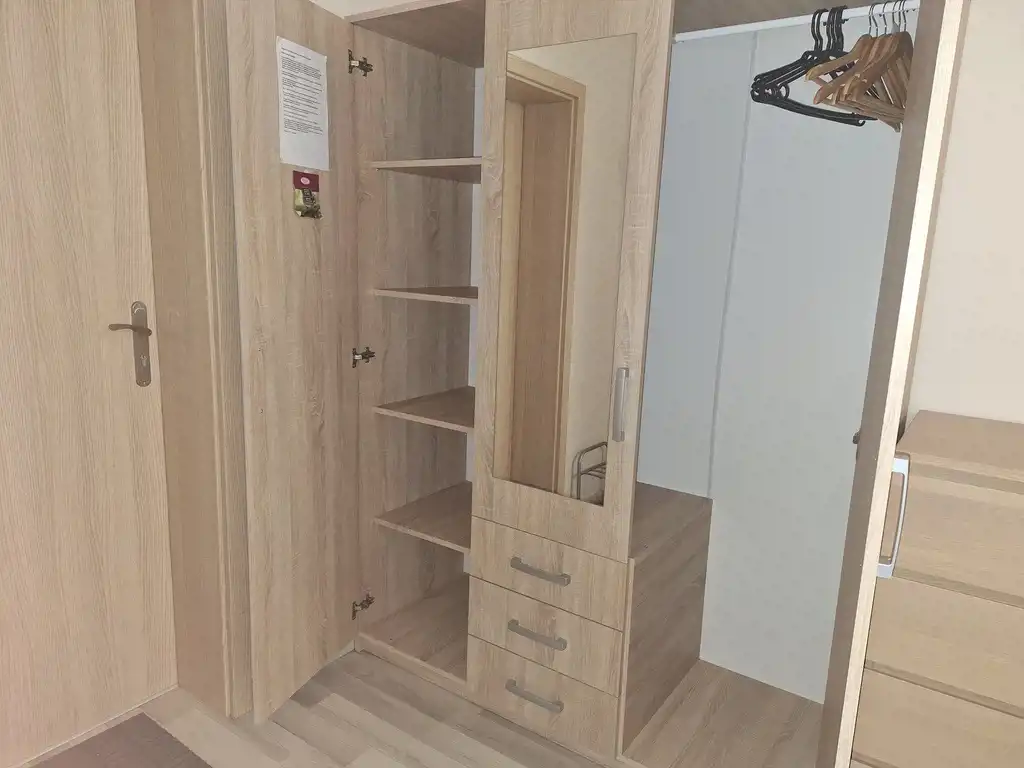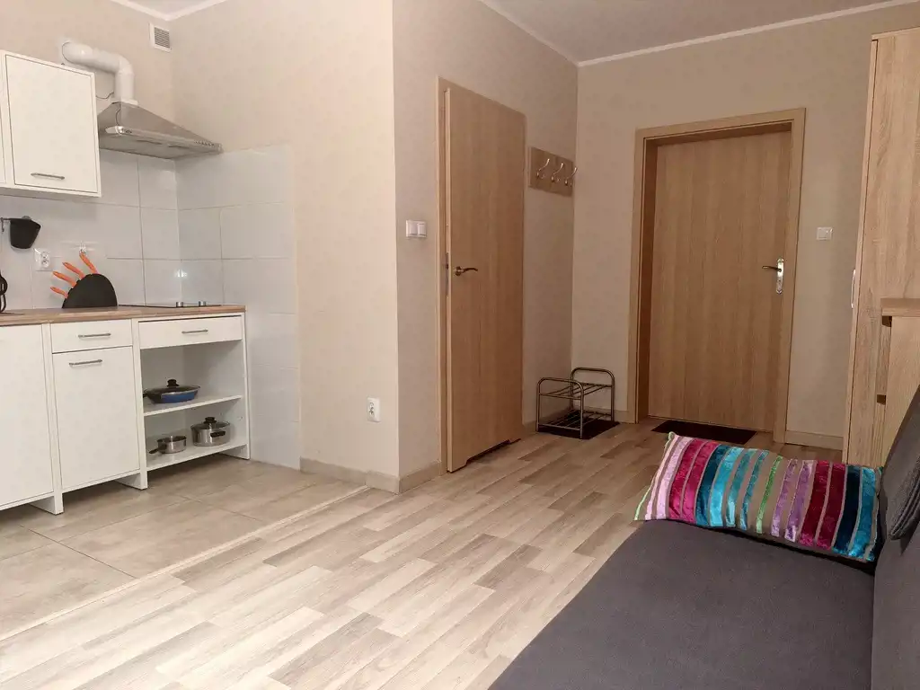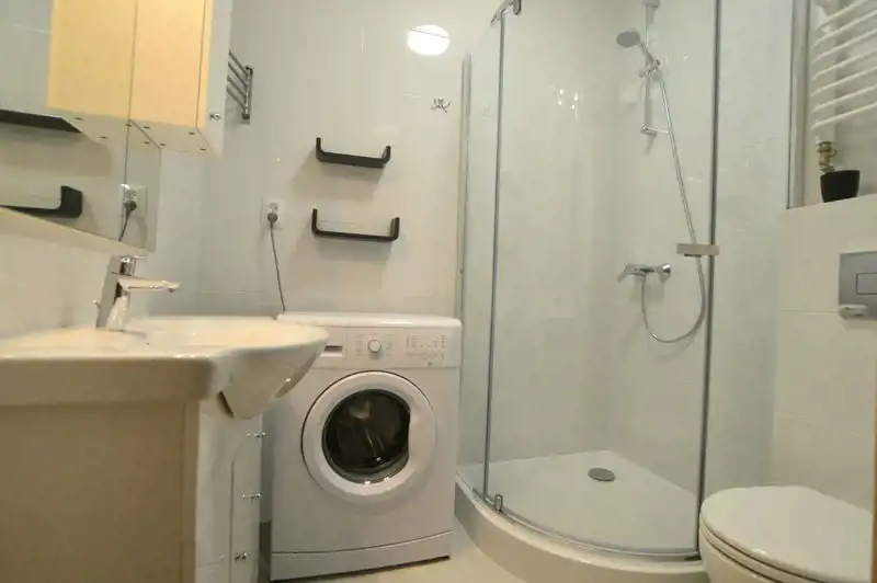 Lokal o powierzchni ok. 24m2 składa się z pokoju z aneksem kuchennym, łazienki z prysznicem, pralką, umywalką i WC.