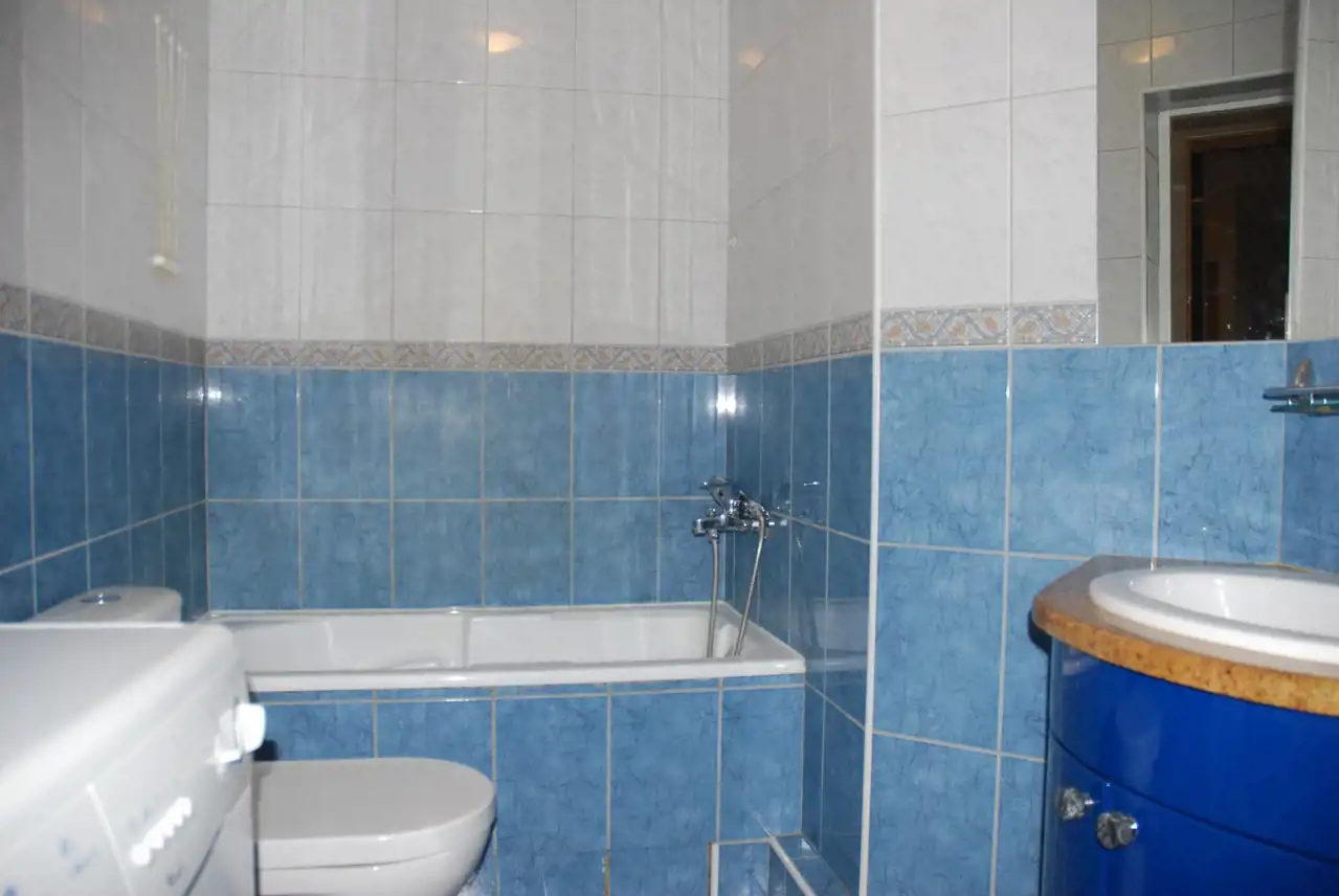 - w łazience: wanna, umywalka z szafką, muszla, pralka,
