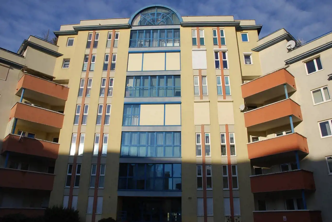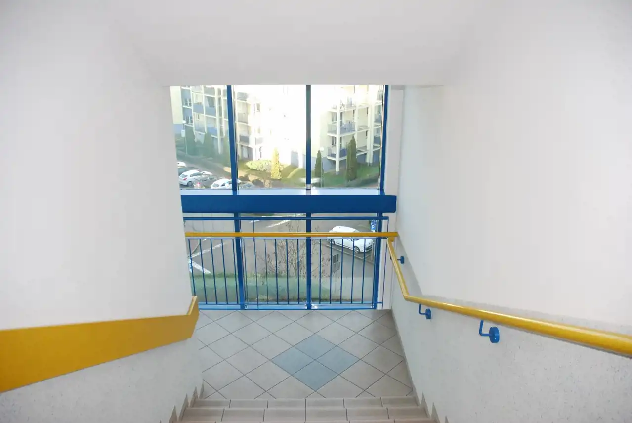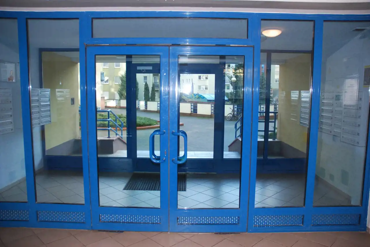 - ładna elewacja budynku, estetyczna klatka schodowa i hol wejściowy.
