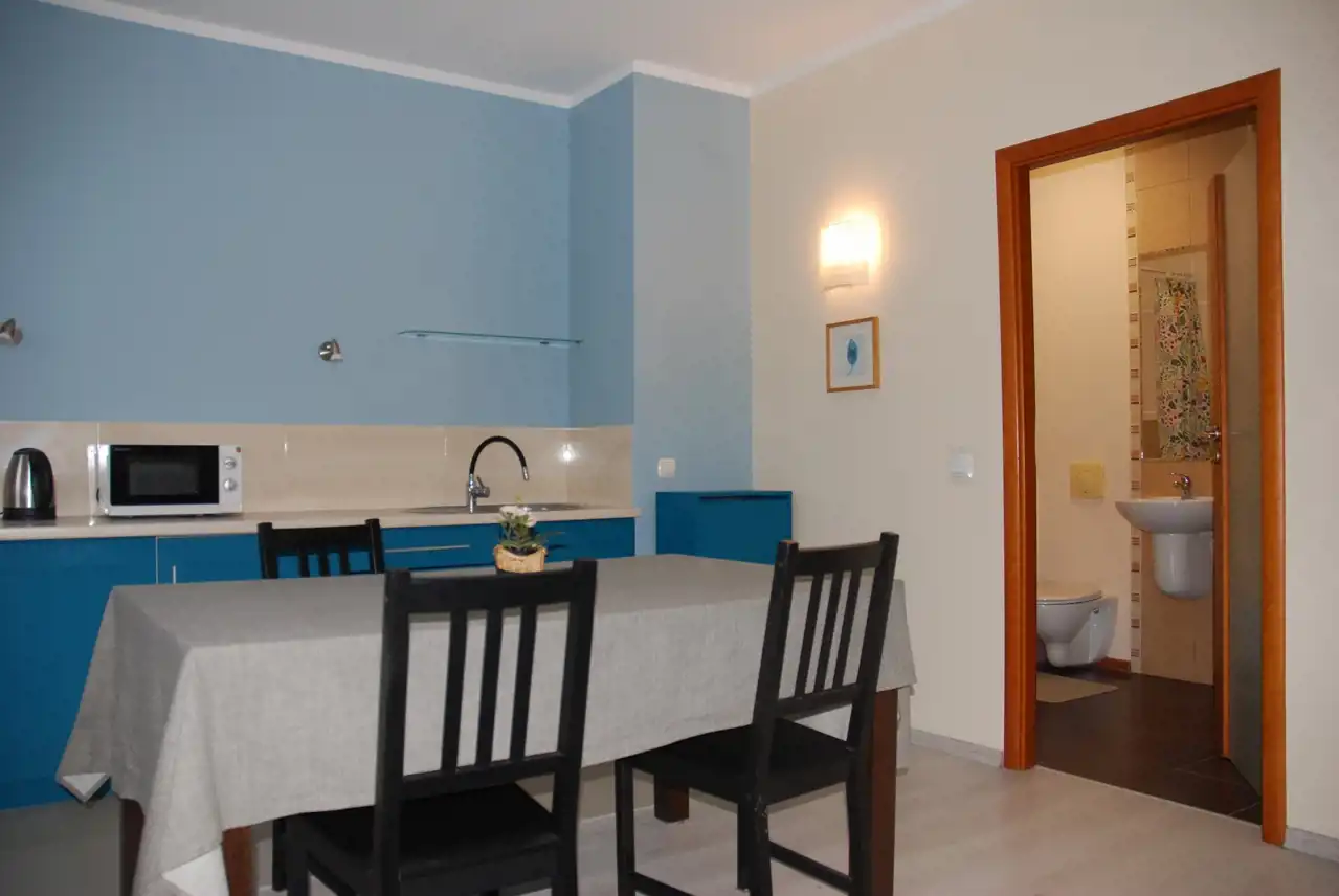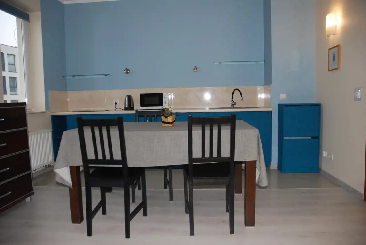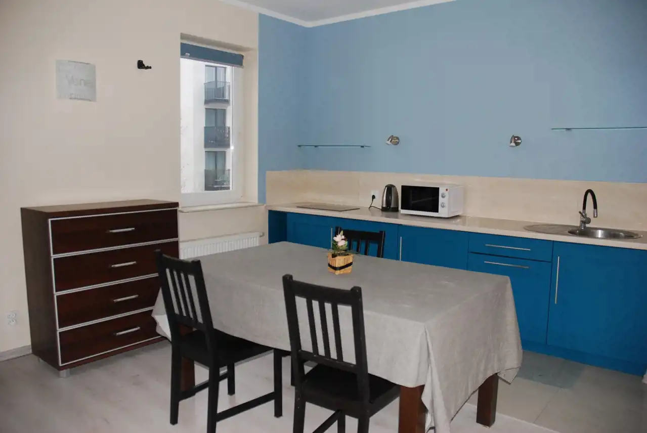 - aneks kuchenny umeblowany w sposób kompletny, z płytą elektryczną, mikrofalówką i czajnikiem elektrycznym oraz lodówko-zamrażarką, z szafkami i pojemnymi szufladami,