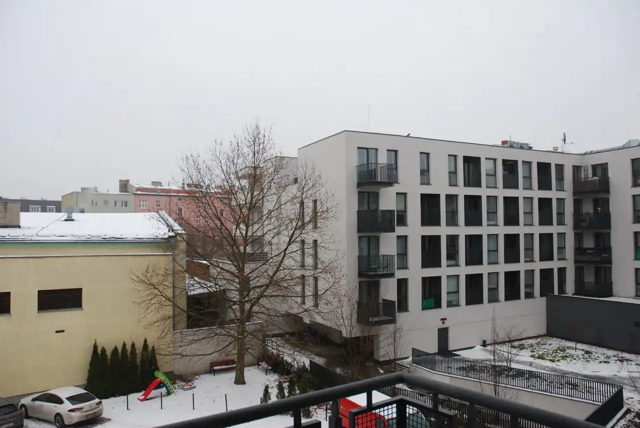 Okna mieszkania wychodzą na cichą stronę z widokiem na estetyczne budunki i czysty dziedziniec - w bardzo dobrej lokalizacji względem ścisłego Centrum i parkowych terenów rekreacyjnych.