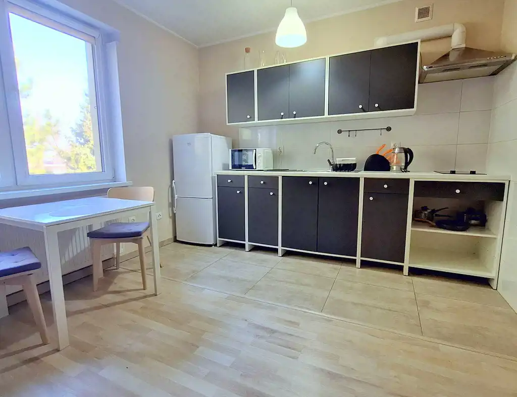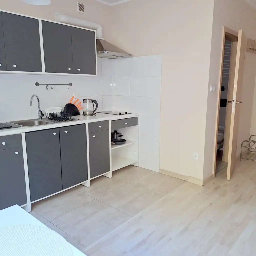 Umeblowane i wyposażone w sprzęty AGD (pralka, mikrofalówka, płyta grzewcza indukcyjna (dwupunktowa), czajnik, lodówka z zamrażalnikiem, wyposażenie drobne (garnki, naczynia, sztućce).