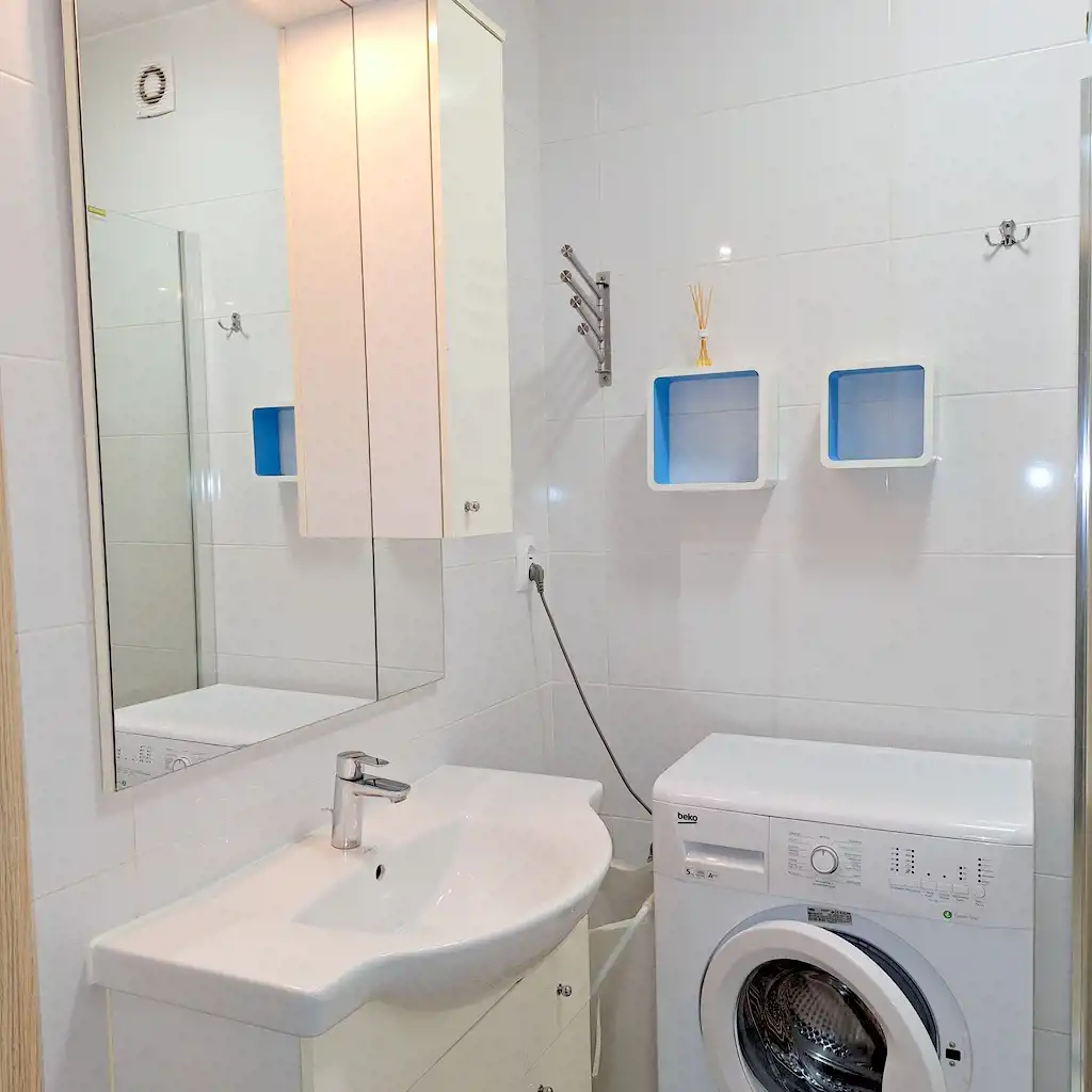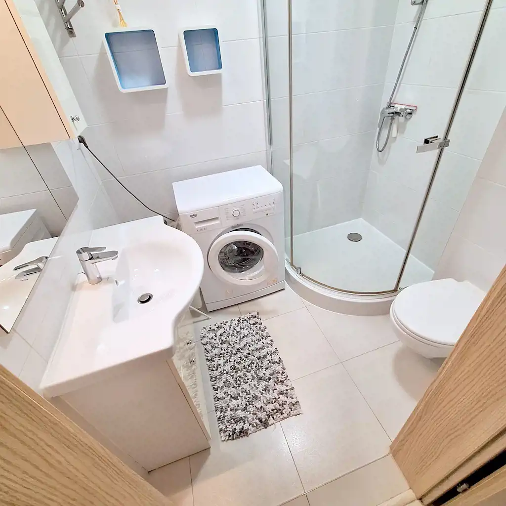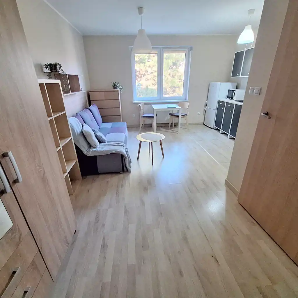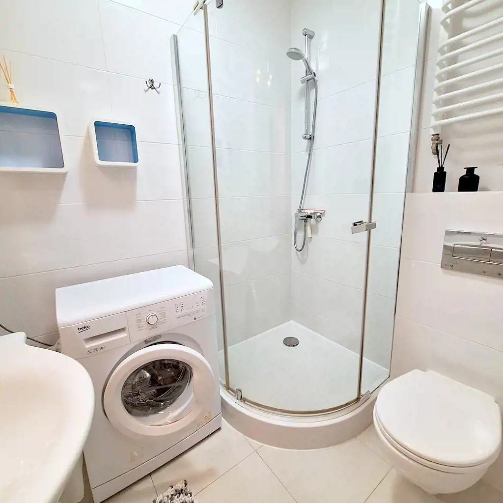 Lokal o powierzchni ok. 24m2 składa się z pokoju z aneksem kuchennym, łazienki z prysznicem, pralką, umywalką i WC.