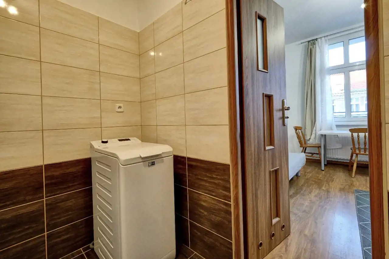 Kuchnia w aneksie, pralka na wyposażeniu w łazience.