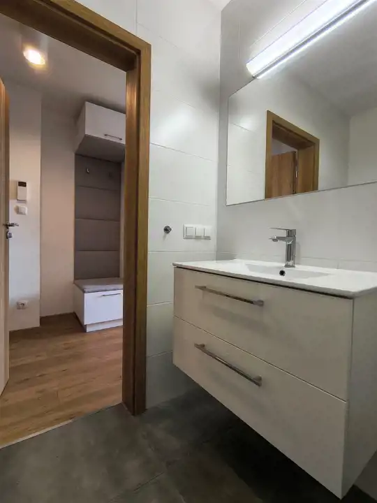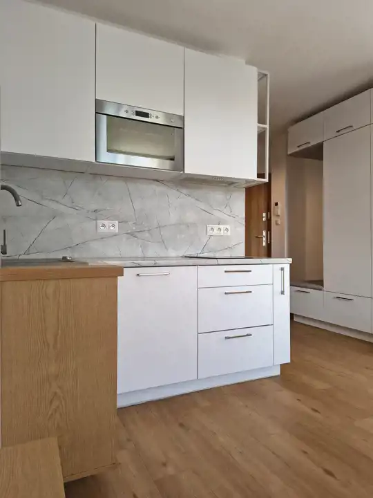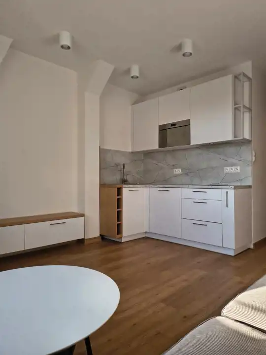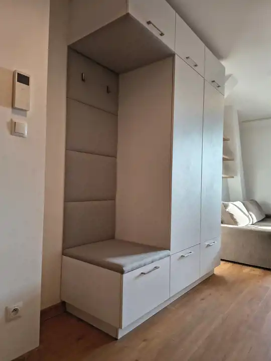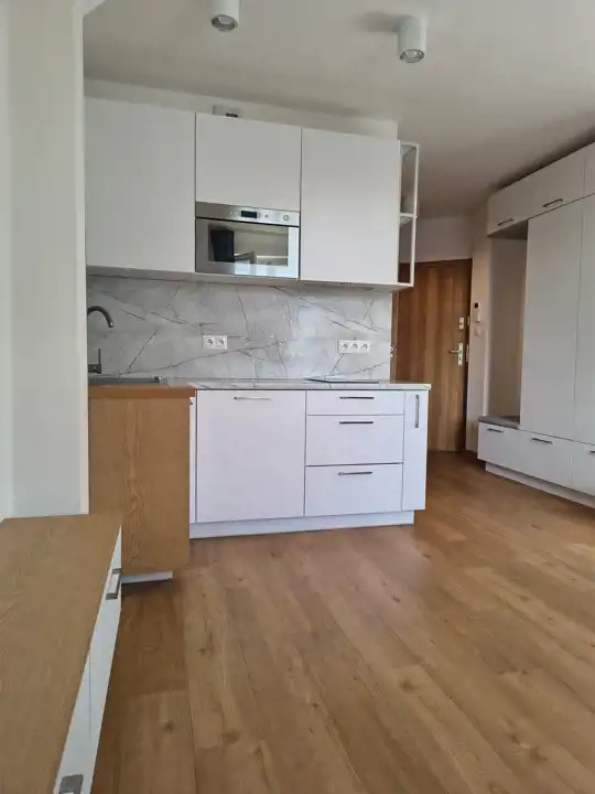 Mieszkanie składa się z pokoju z aneksem kuchennym, łazienki i przedpokoju.