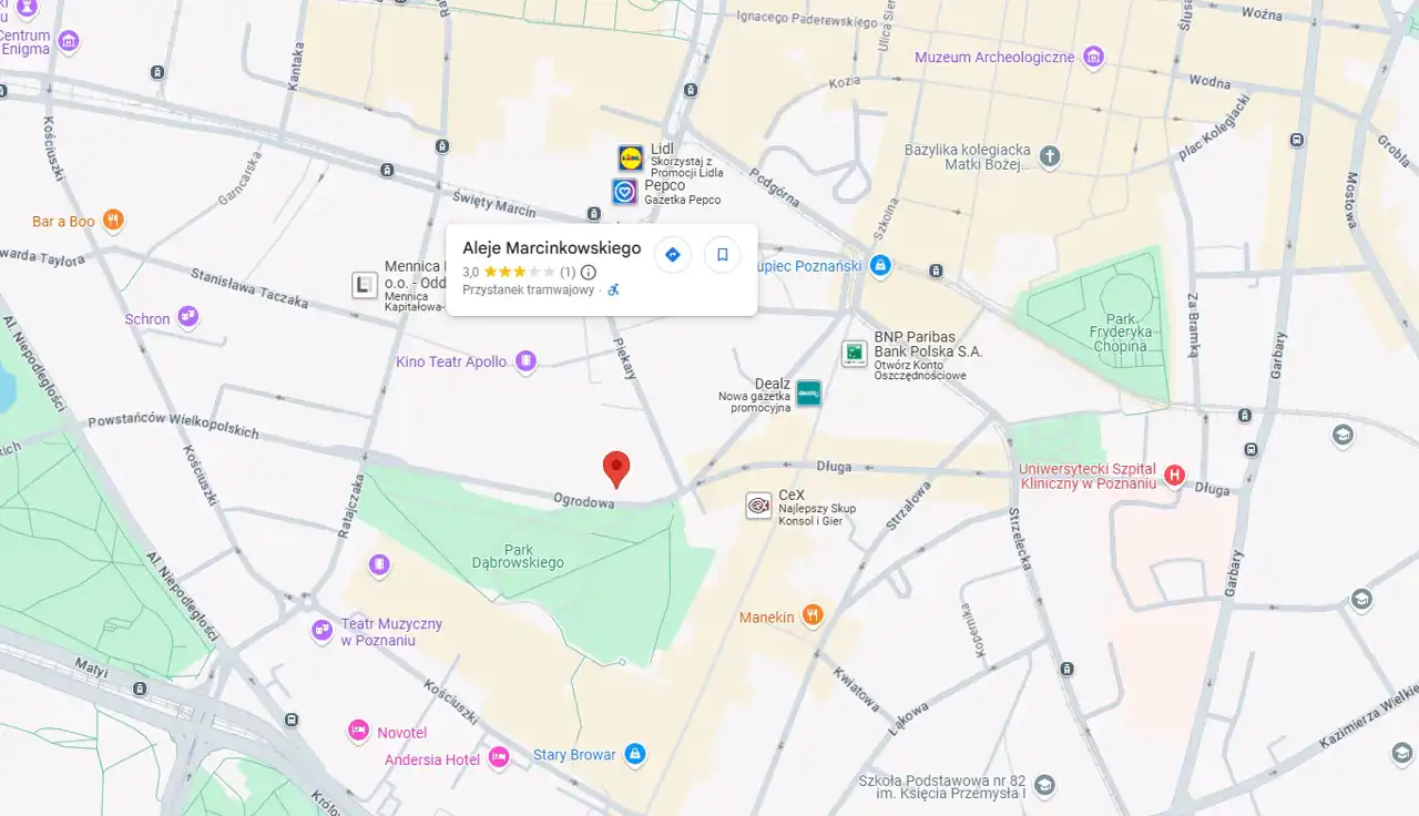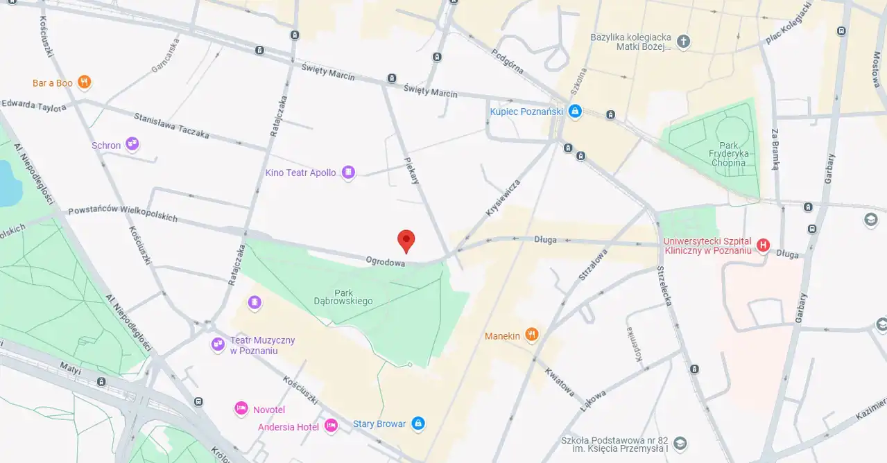 Mieszkanie znajduje się w nowoczesnym budynku (Ataner) przy ul. Ogrodowej, w ścisłym centrum Poznania i jednej z lepiej skomunikowanych części Poznania. W okolicy dostępna jest rozwinięta infrastruktura handlowo-usługowa, a zaledwie kilka minut spacerem znajduje się centrum handlowe w mieście – Stary Browar lub Kupiec Poznański. Mieszkanie położone jest w pobliżu skrzyżowania ulic Królowej Jadwigi i Półwiejskiej, co gwarantuje doskonały dojazd dzięki wielu liniom tramwajowym (2, 6, 9, 10, 12, 14, 15, 18, 19). Bliskość poznańskich uczelni, takich jak Politechnika Poznańska, UEP, AWF i wielu innych uczelni, czyni to mieszkanie idealnym wyborem dla studentów. Dodatkowym atutem jest szybki dostęp do terenów rekreacyjnych np. Park Dąbrowskiego lub Park im. Karola Marcinkowskiego, co pozwala na aktywny wypoczynek w wolnym czasie. W budynku, w którym znajduję się mieszkanie jest pasaż, a w nim dostęp do usług takich jak: restauracja, salon masażu, kosmetyczka itp.