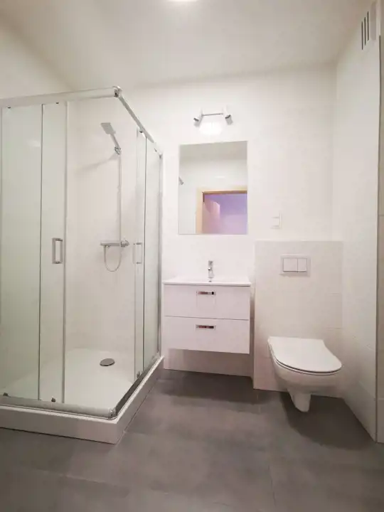 W łazience, prysznic, toaleta, umywalka z szafką, lustro, pralka.