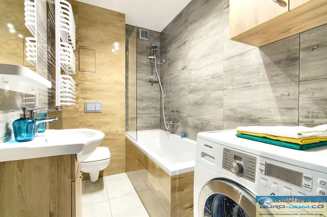 Łazienka – w pełni wyposażona, z pralką oraz kabiną prysznicową.