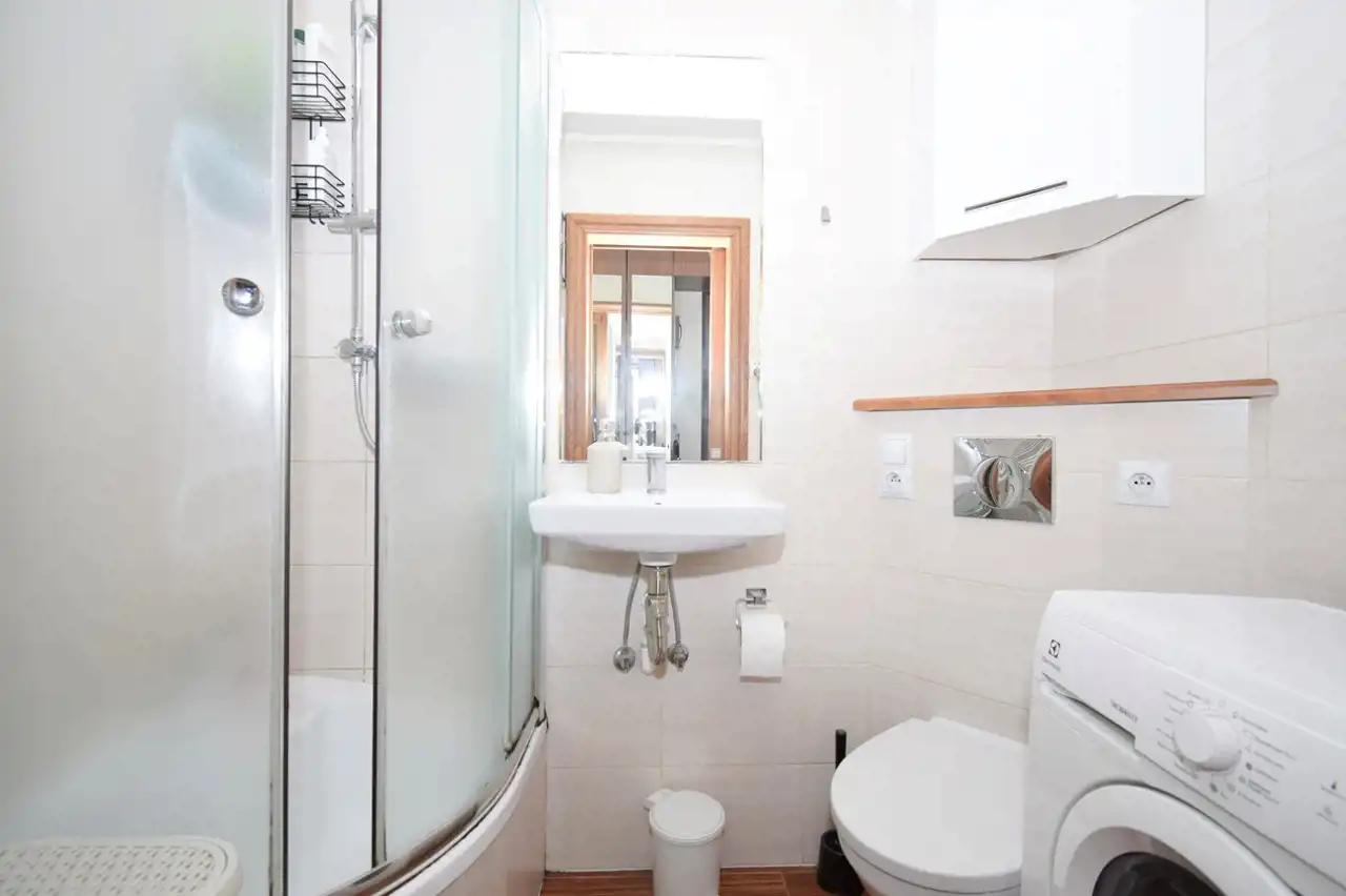 Łazienka wyposazona została w kabinę prysznicową, wc, umywalkę i pralkę.