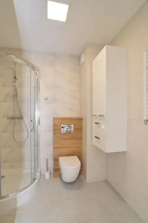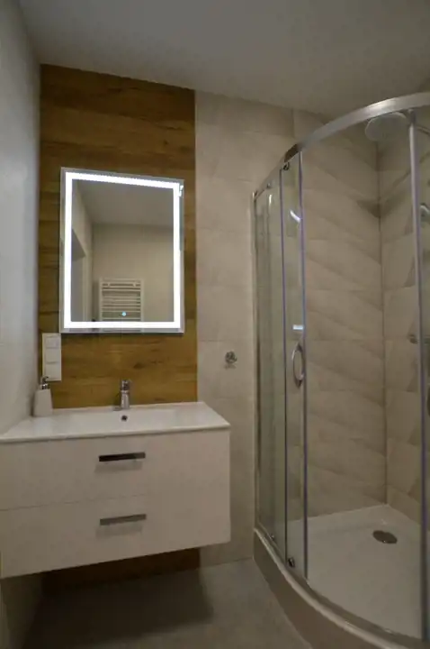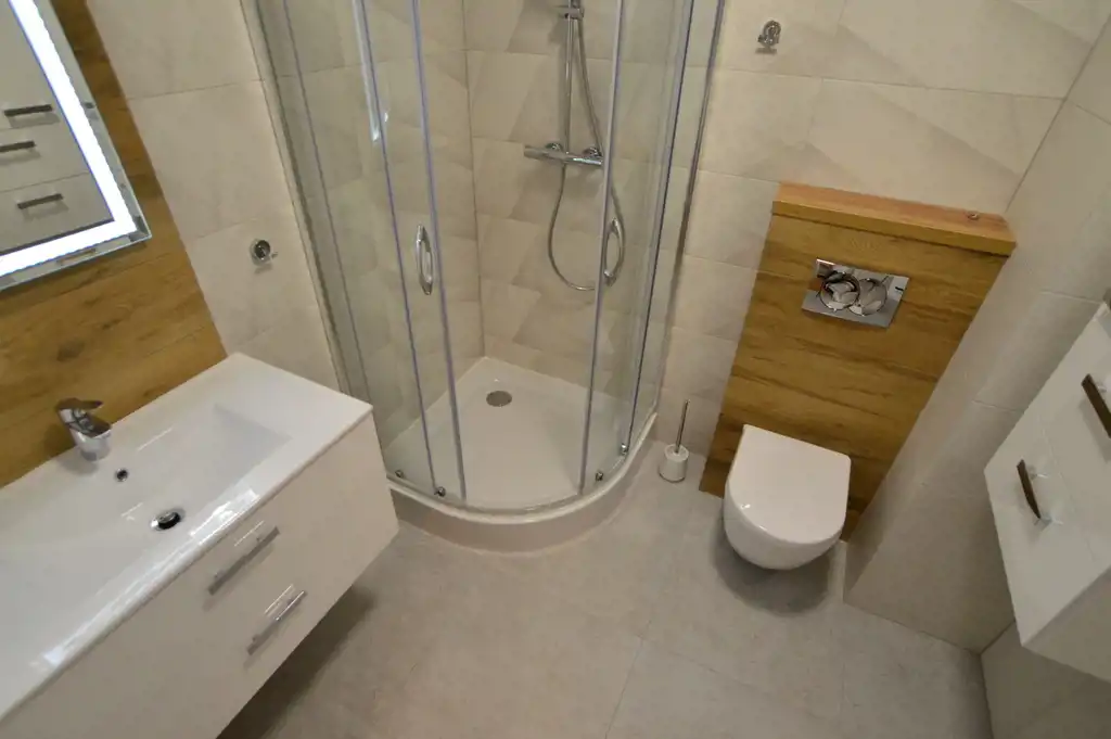 łazienka: kabina prysznicowa, umywalka z szafką,lustro, szafka łazienkowa wisząca, WC, pralka.