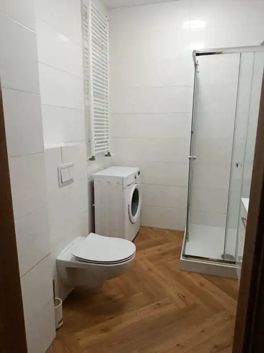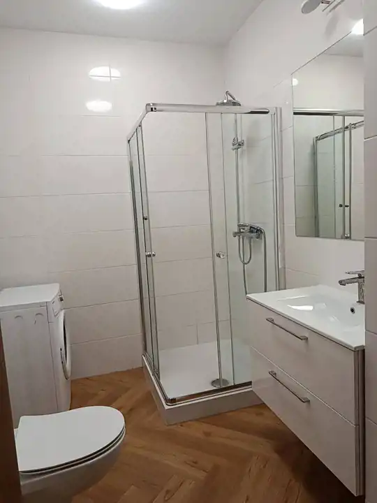 Łazienka: kabina prysznicowa, toaleta, umywalka z szafką, lustro, oświetlenie, pralka.