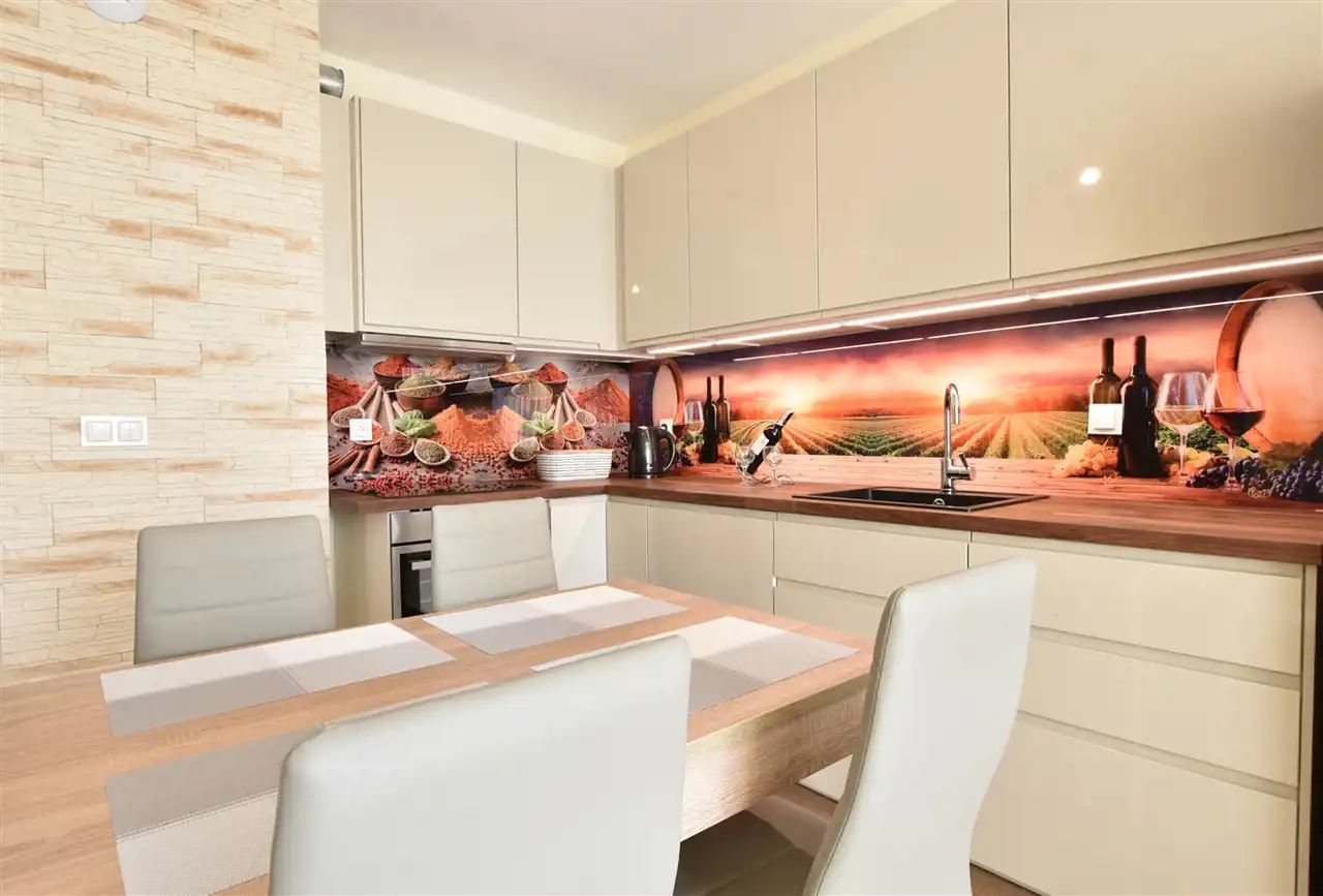 Aneks kuchenny wyposażony w meble kuchenne w zabudowie, sprzęty takie jak lodówka wolnostojąca, płyta grzewcza, piekarnik elektryczny w zabudowie, okap kuchenny, zmywarka.