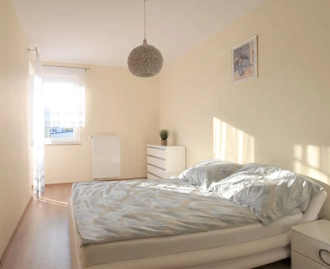 Sypialnia z łóżkiem z nowym materacem i dwoma szafkami nocnymi.