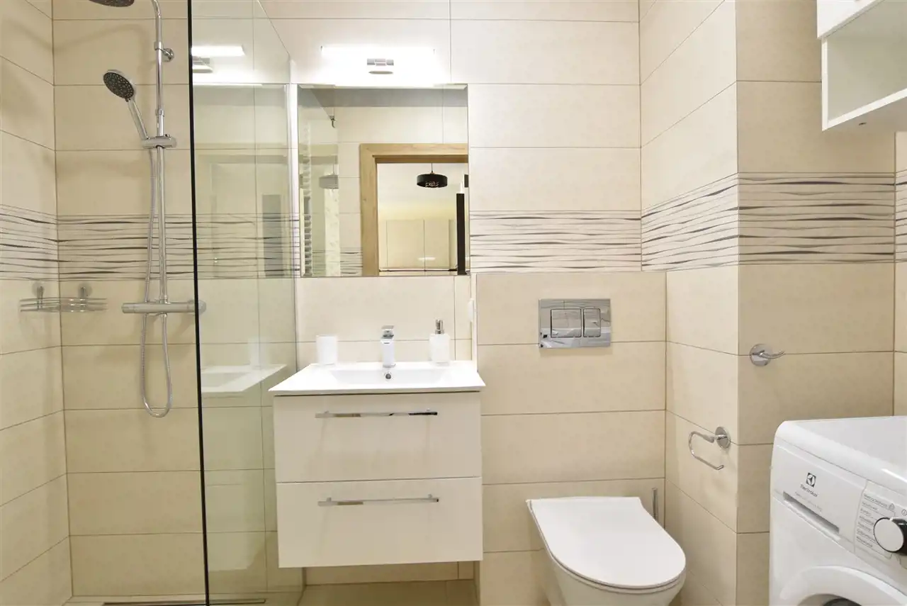 łazienka z prysznicem, pralką