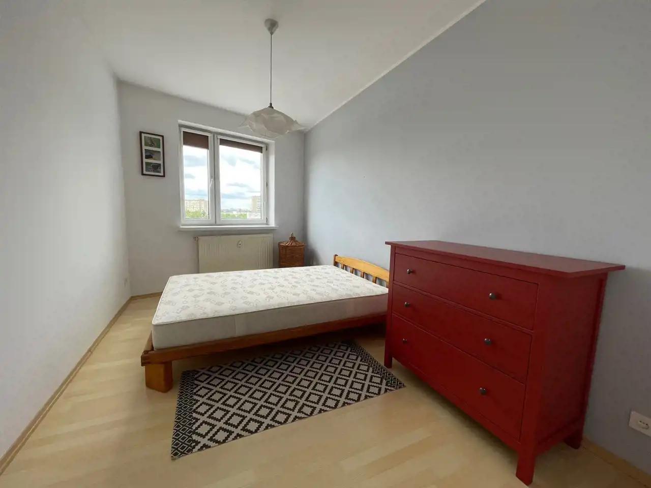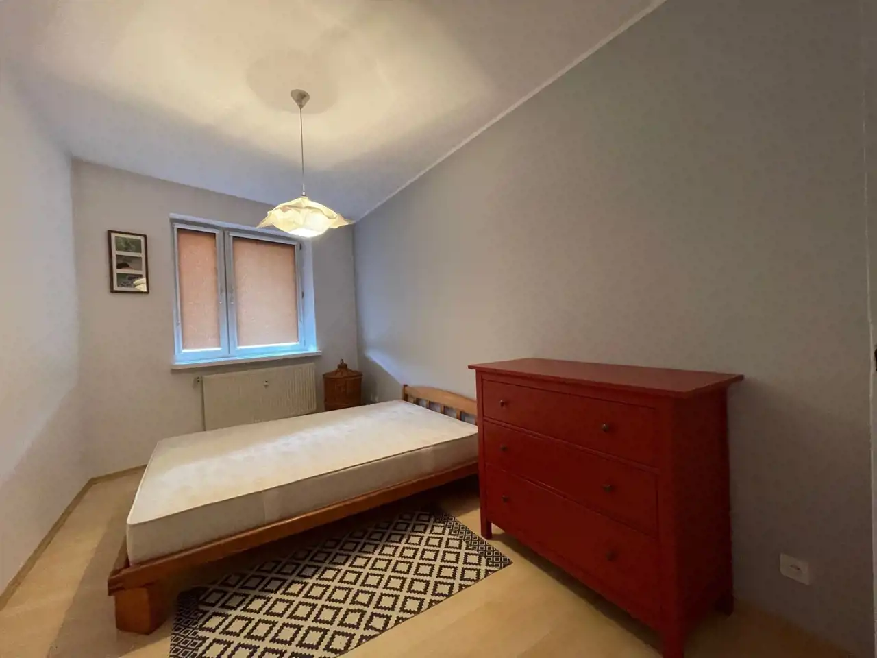 Sypialnia: łóżko dwuosobowe, komoda.