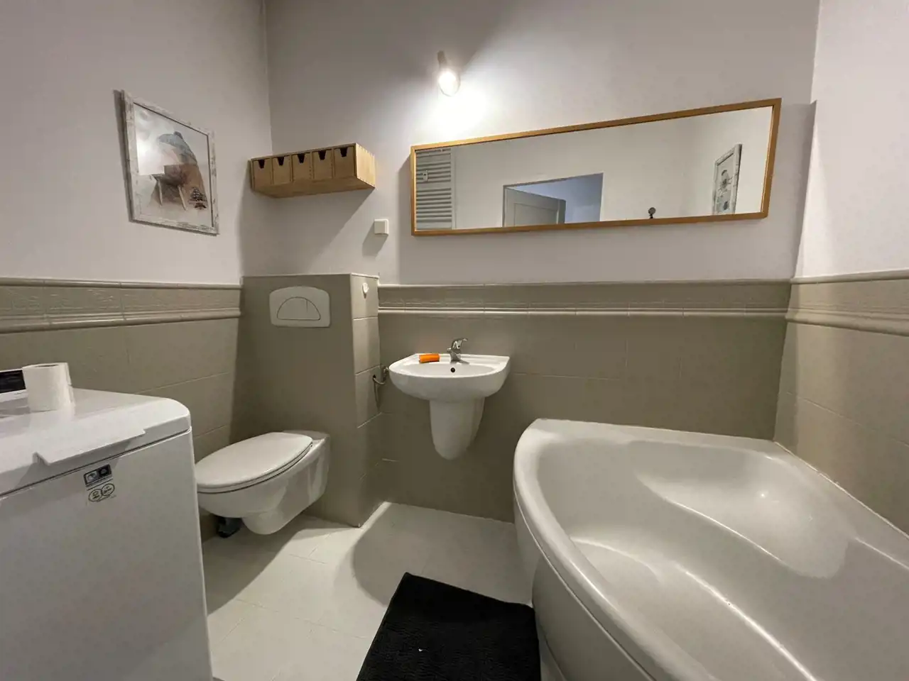 Duży pokój połączony z otwartą kuchnią; sypialnia; łazienka z WC, wanną i pralką.