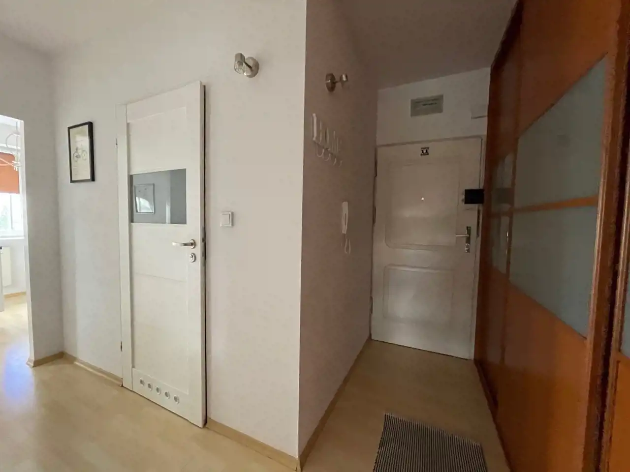 W przedpokoju pojemna szafa w zabudowie typu Komandor.