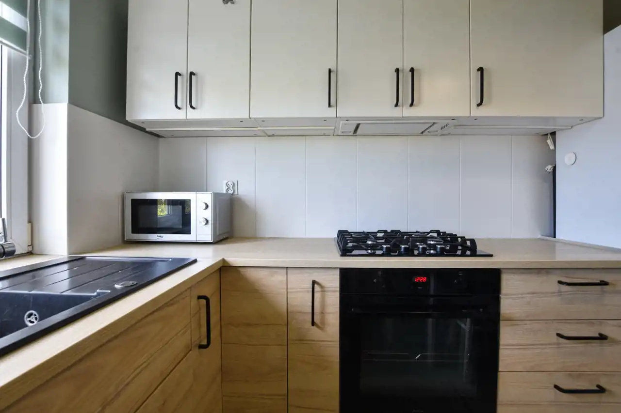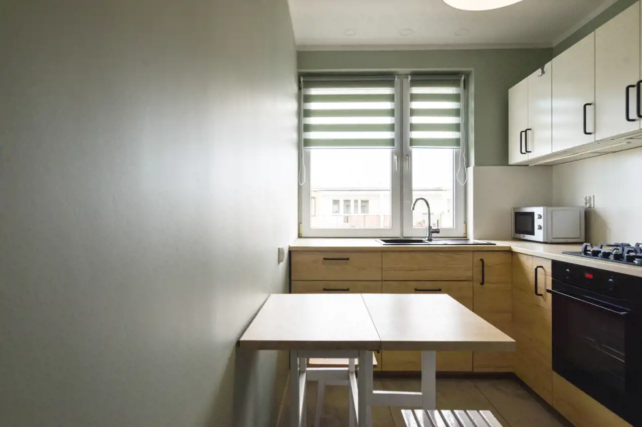 Kuchnia z pełnym sprzętem AGD: chłodziarko – zamrażalka, piekarnik w zabudowie, płyta gazowa, okap kuchenny (brak zmywarki). Kuchnia z oknem, z dużym blatem roboczym, wyposażona z pojemne szafki kuchenne, liczne dogodne rozwiązania takie jak zlewozmywak usytuowany pod oknem, liczne szuflady i wiele innych. Część jadalniana wyposażona w rozkładany stół i krzesła/taborety.