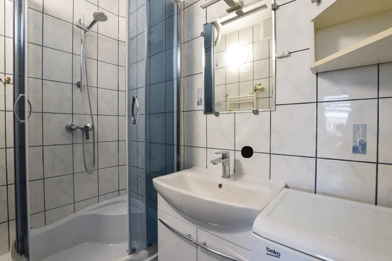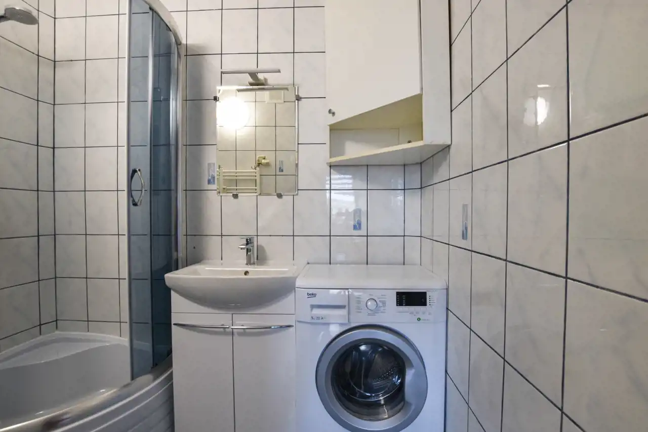 Przestronna łazienka z meblami łazienkowymi, pralką, kabiną prysznicową z zestawem natryskową, umywalką.