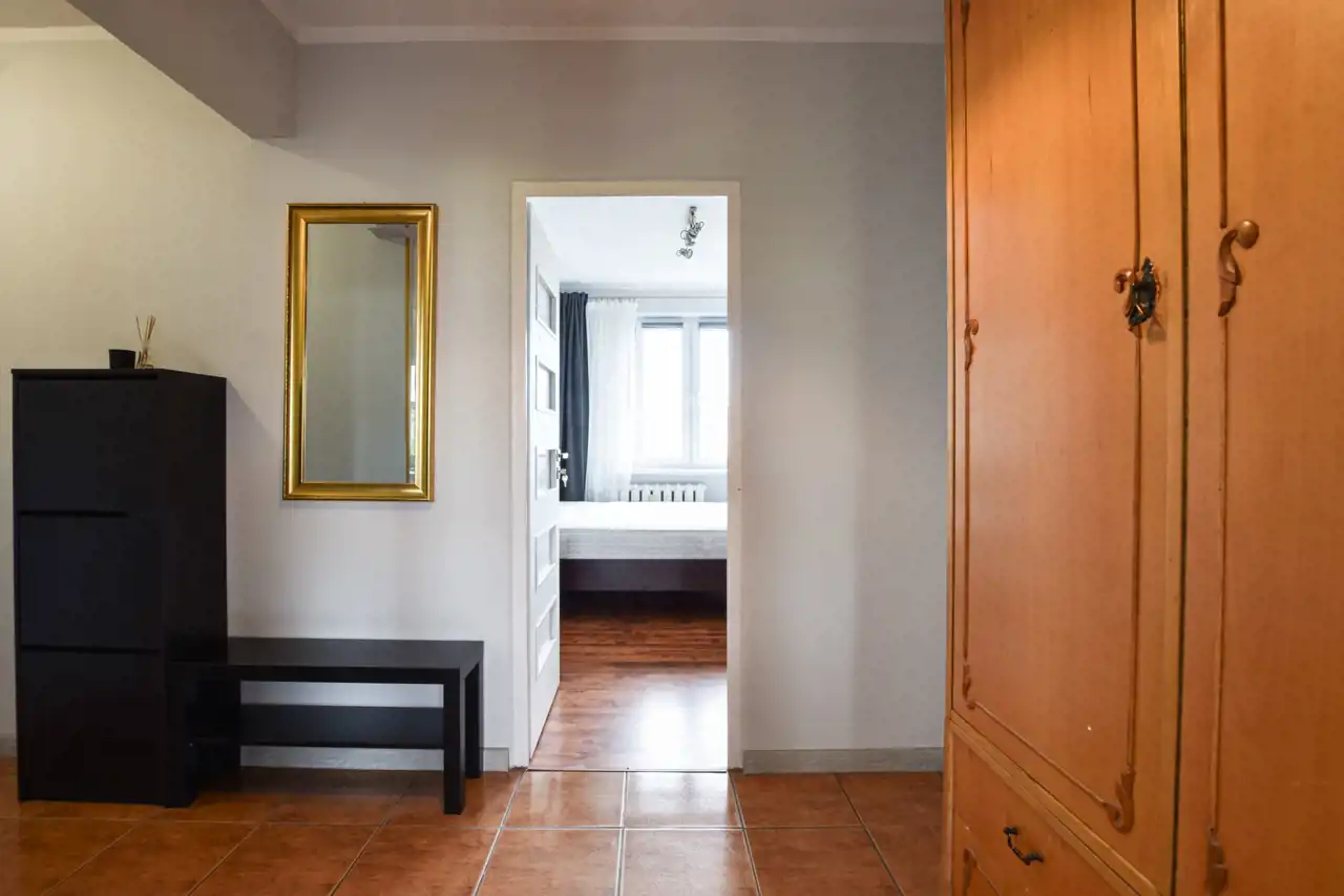 Korytarz z szafą, miejscem do przechowywania, ozdobnym lustrem.