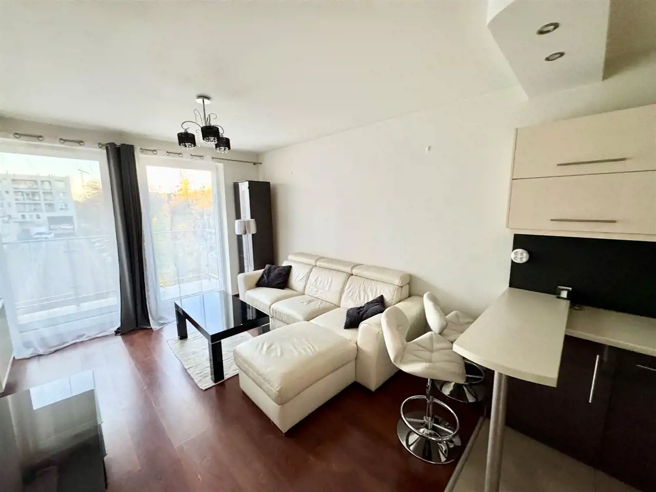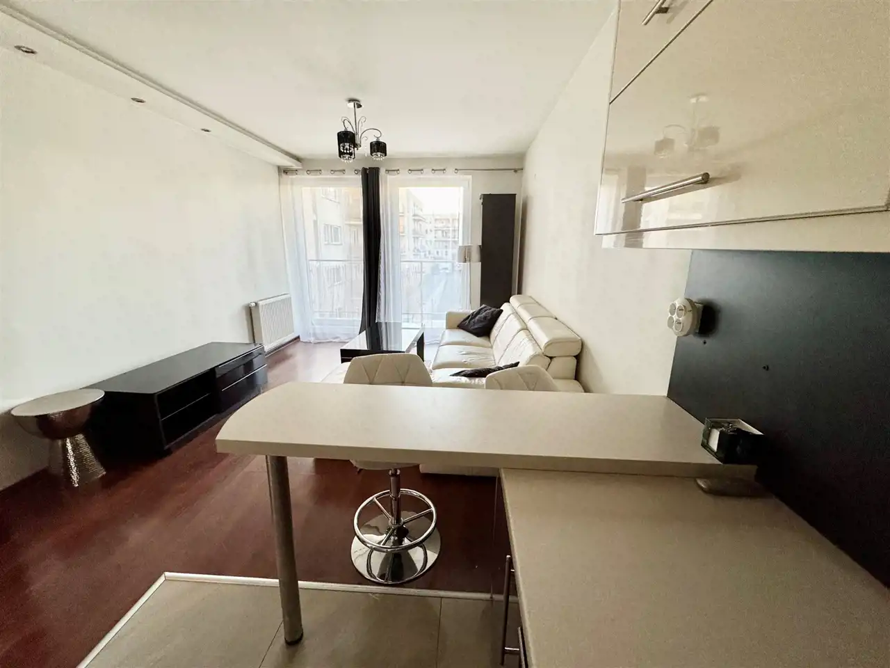 Mieszkanie w pełni umeblowane. Kuchnia w zabudowie wraz ze sprzętem AGD (lodówka, zmywarka 45', płyta grzewcza). W kuchni przy blacie dwa hokery, idealne miejsce do zjedzenia posiłku.