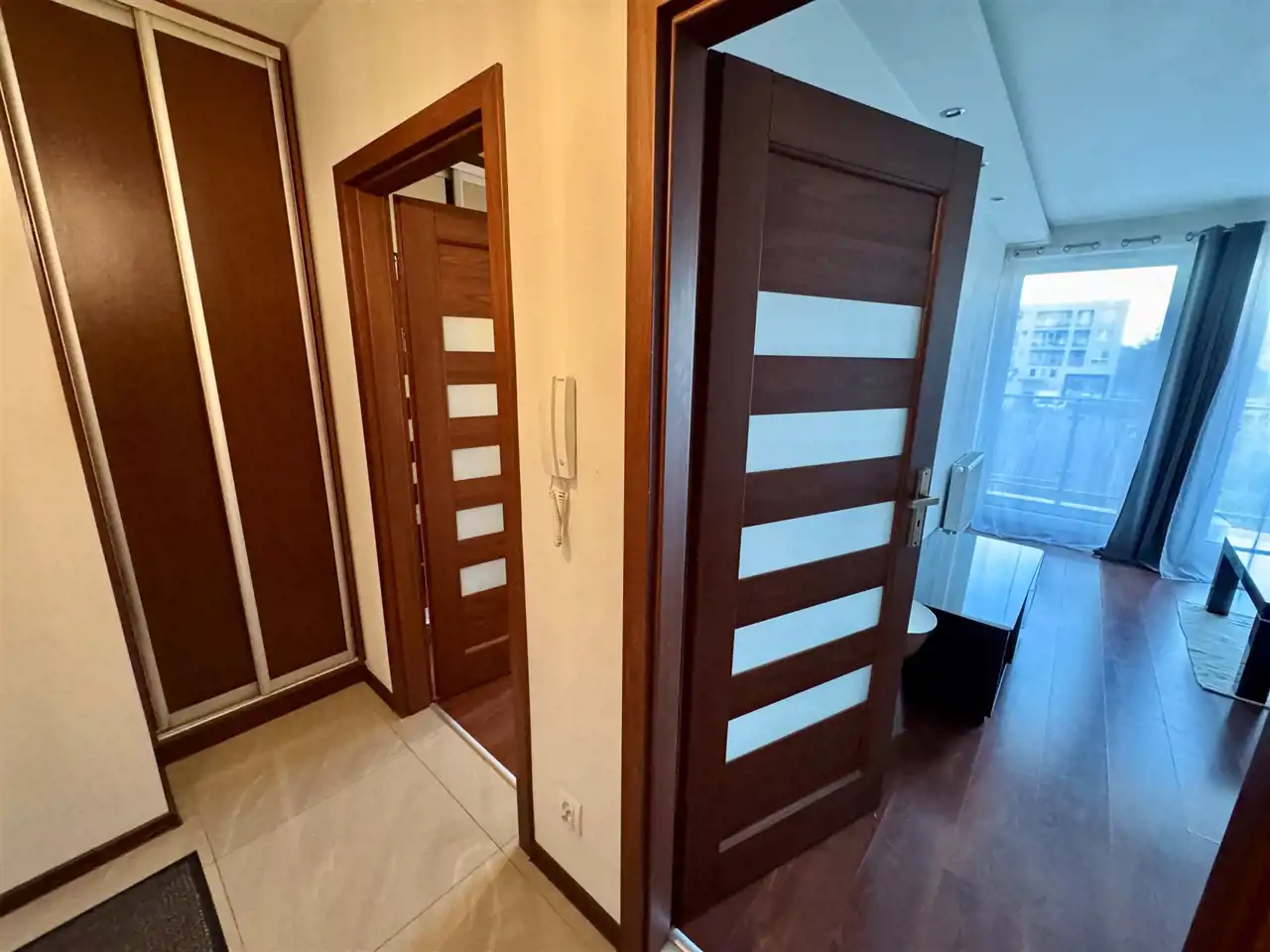 Mieszkanie składa się z pokoju dziennego połączonego z aneksem kuchennym, oddzielnej sypialni, łazienki i korytarza. Wzdłuż całego mieszkania jest balkon z widokiem na osiedle.