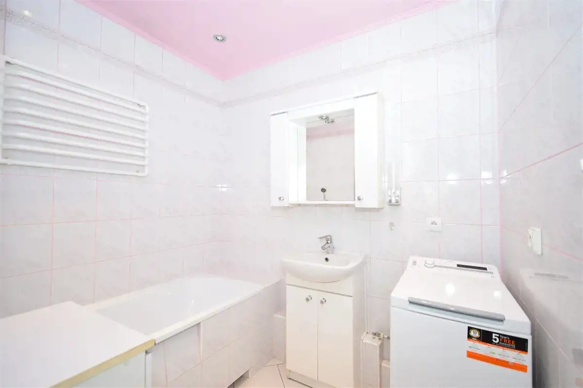Łazienka wyposażona została w wannę, umywalkę, pralkę i szafkę.