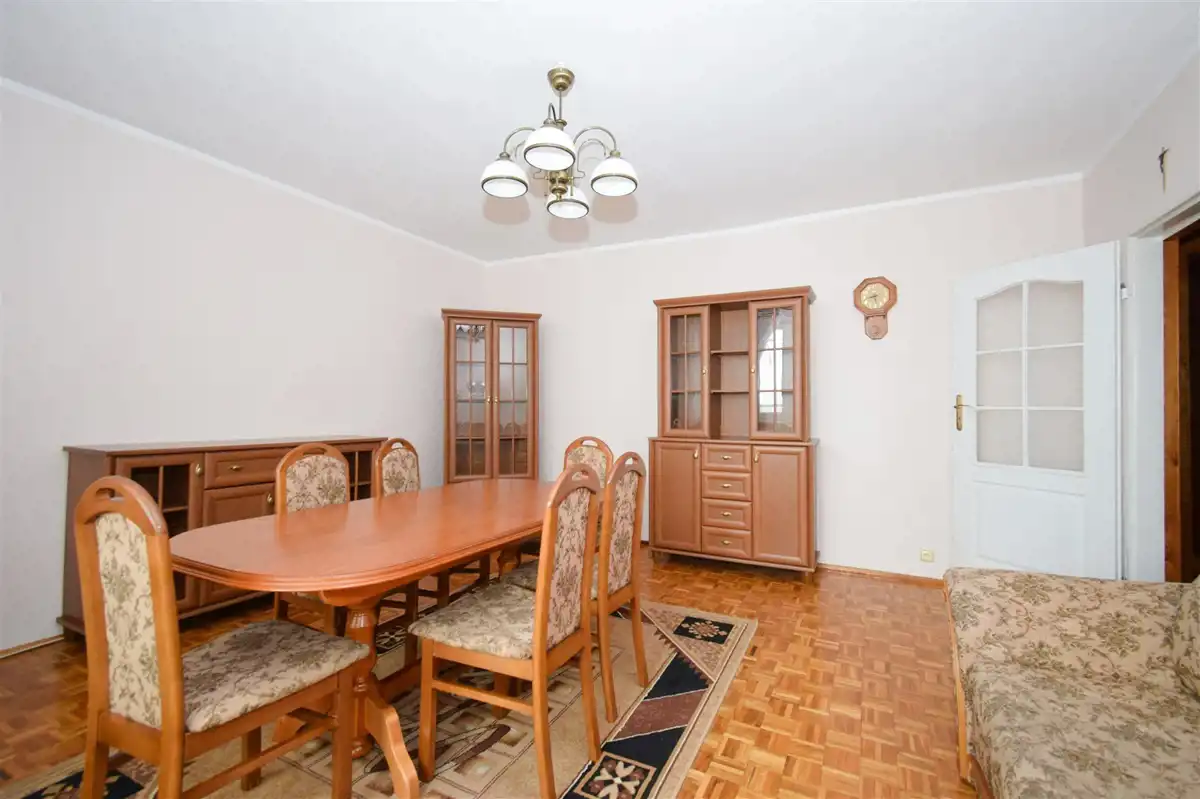 W pokoju o powierzchni 21,8 mkw znajduje się kanapa, stół, 6 krzeseł, szafy z witryną, szafka RTV i telewizor.