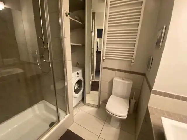 Łazienka w płytkach, z kabiną prysznicową i pralką.