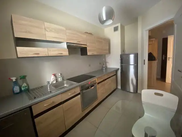 Kuchnia w pełni wyposażona: zmywarka, piekarnik, lodówka, płyta elektryczna oraz pochłaniacz.