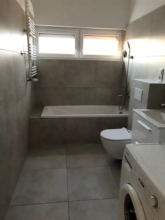 W kuchni nowe meble kuchenne oraz sprzęt AGD (płyta grzewcza, piekarnik elektryczny, okap, lodówka z zamrażalką, zlew z baterią). Łazienka w płytach, wanna, toaleta, umywalka z szafką.
