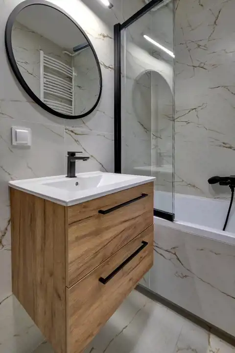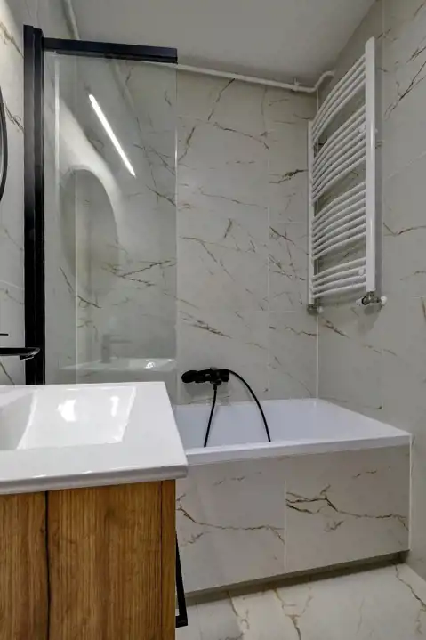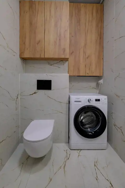 W łazience /4,4 m2/ wanna, na wyposażeniu pralka 60cm, Whirlpool.