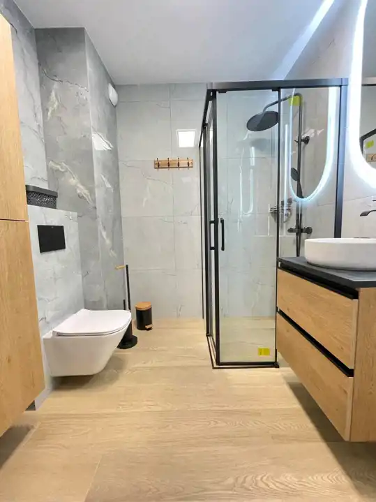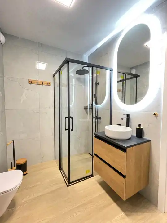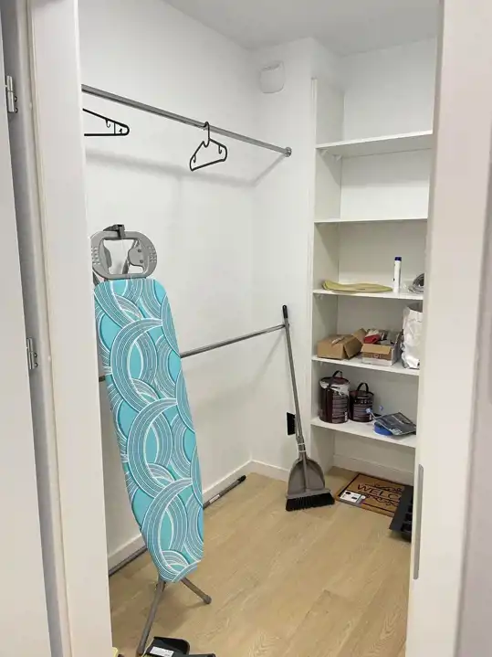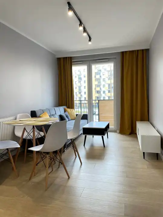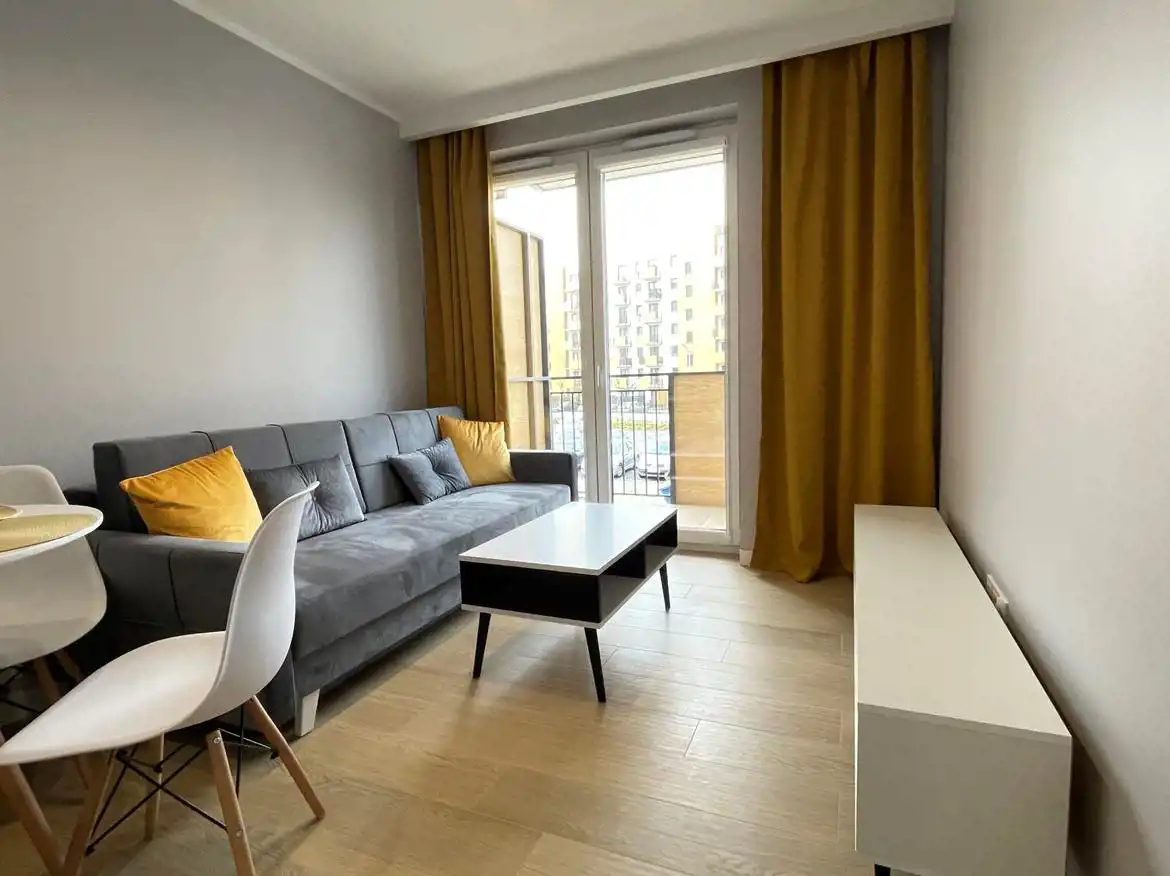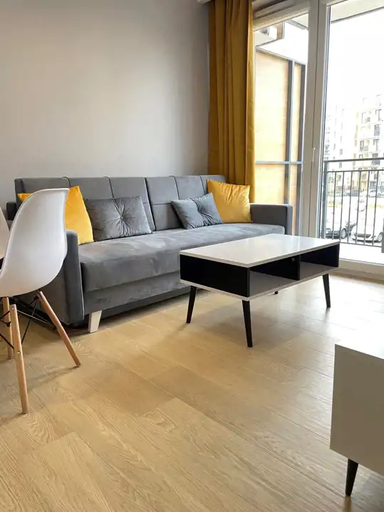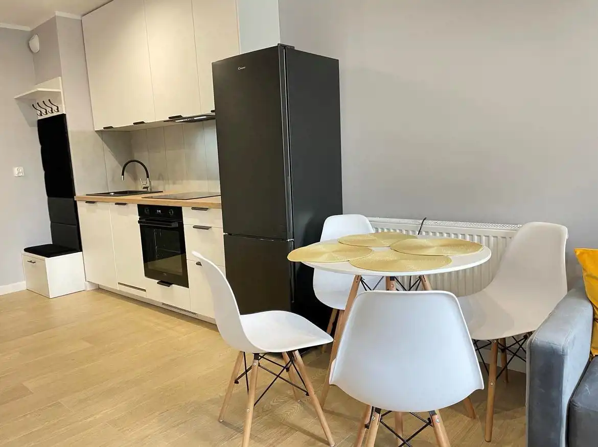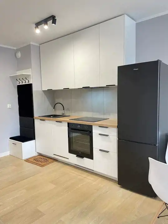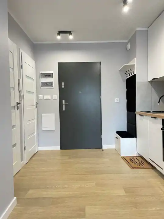 Mieszkanie jest kompletnie oraz gustownie wyposażone. Nieruchomość składa się z komfortowej łazienki z wygodną kabiną prysznicową, toaletą, umywalką oraz pralką. Salon jest połączony z aneksem kuchennym, z którego można wyjść na balkon. Dodatkowo w mieszkaniu został wydzielony schowek z licznym półkami oraz wieszakami. Aneks kuchenny jest wyposażony w piekarnik, płytę indukcyjną, zmywarkę. Sofa w salonie posiada funkcję spania. Sypialnia wyposażona w łóżko oraz bardzo dużą szafę.