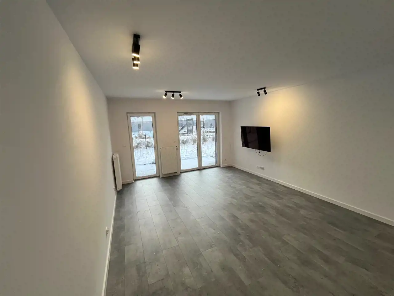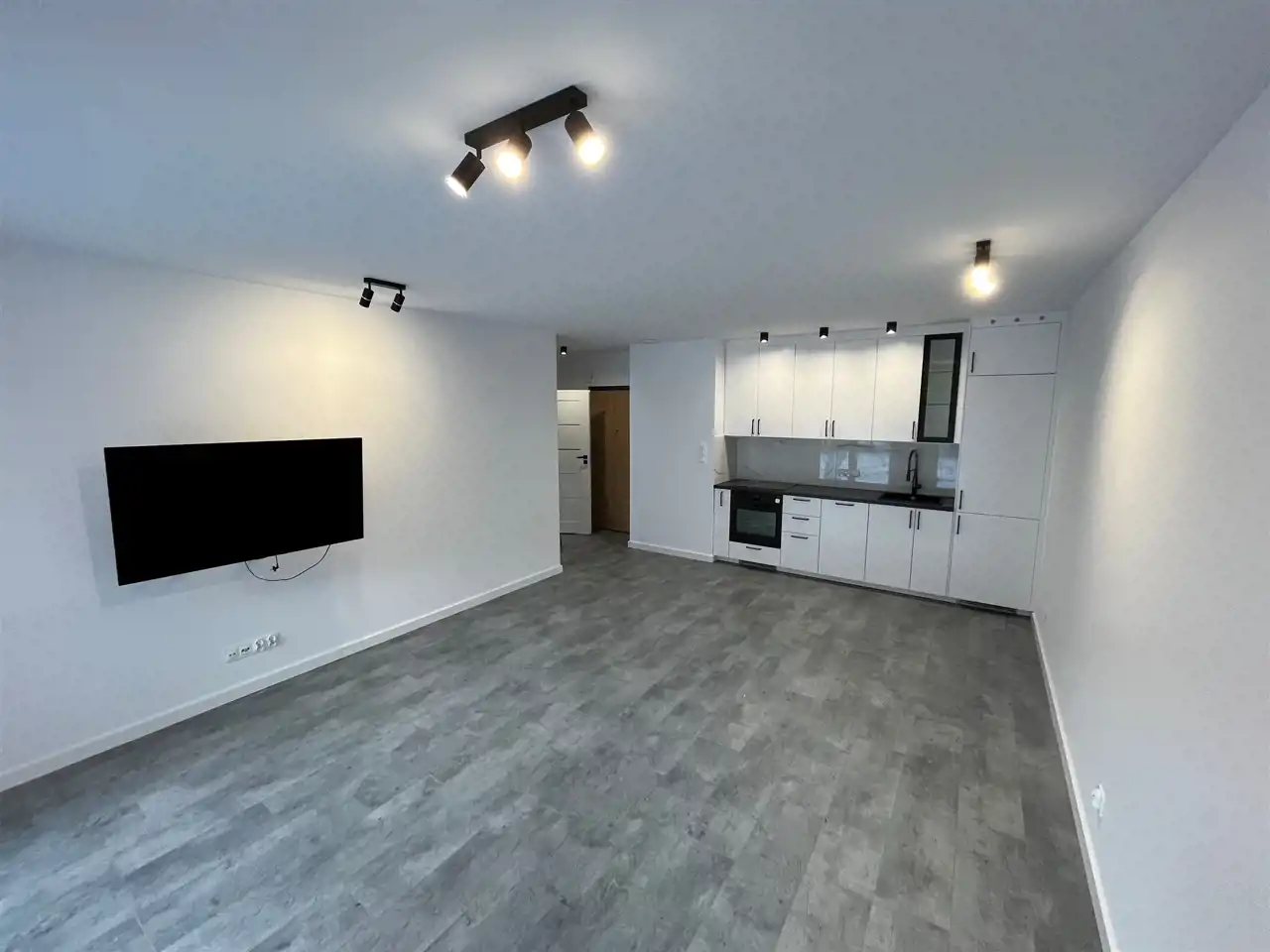 - Salon z aneksem kuchennym: wyłożony panelami podłogowymi, kanapa, duży telewizor. Kuchnia z dużą ilością szafek wyposażona m.in piekarnik, pochłaniacz, lodówka, zmywarka, zlew oraz płyta indukcyjna. Z salonu bezpośrednie wyjście na taras i ogródek.