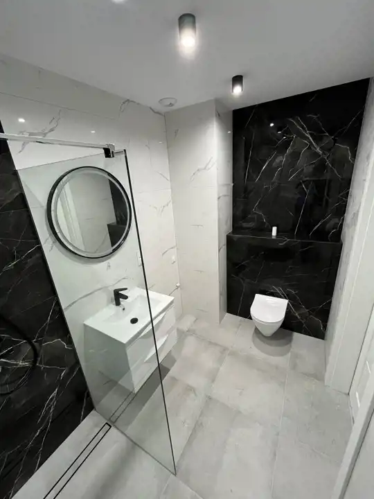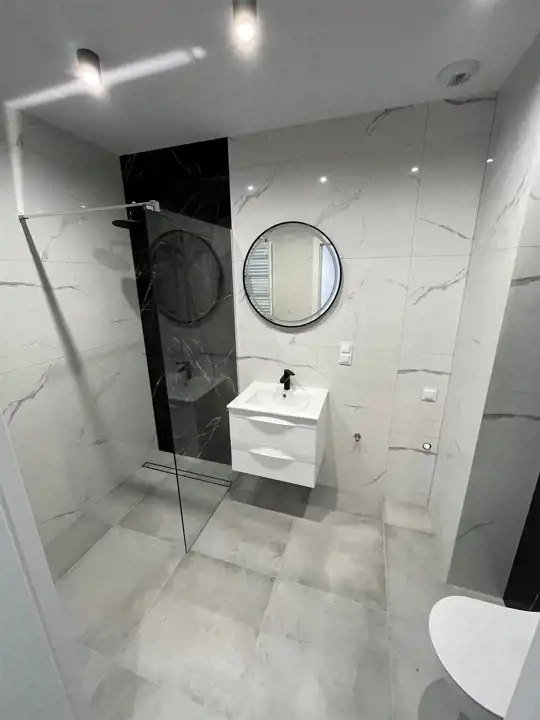 - Łazienka: w pełni wykończona, wysokiej klasy glazura, komfortowy prysznic z natryskiem, umywalka, duże lustro, wc w zabudowie.
