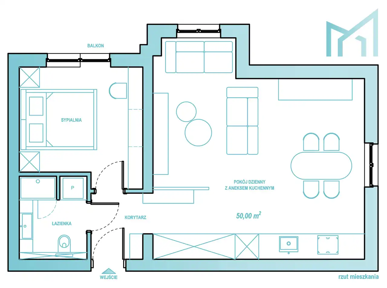 - Charakterystyka mieszkania 50 m2, 2 pokoje
