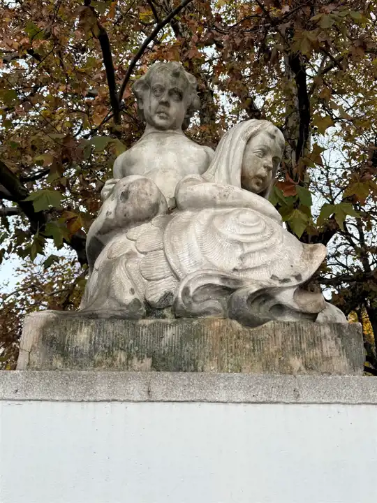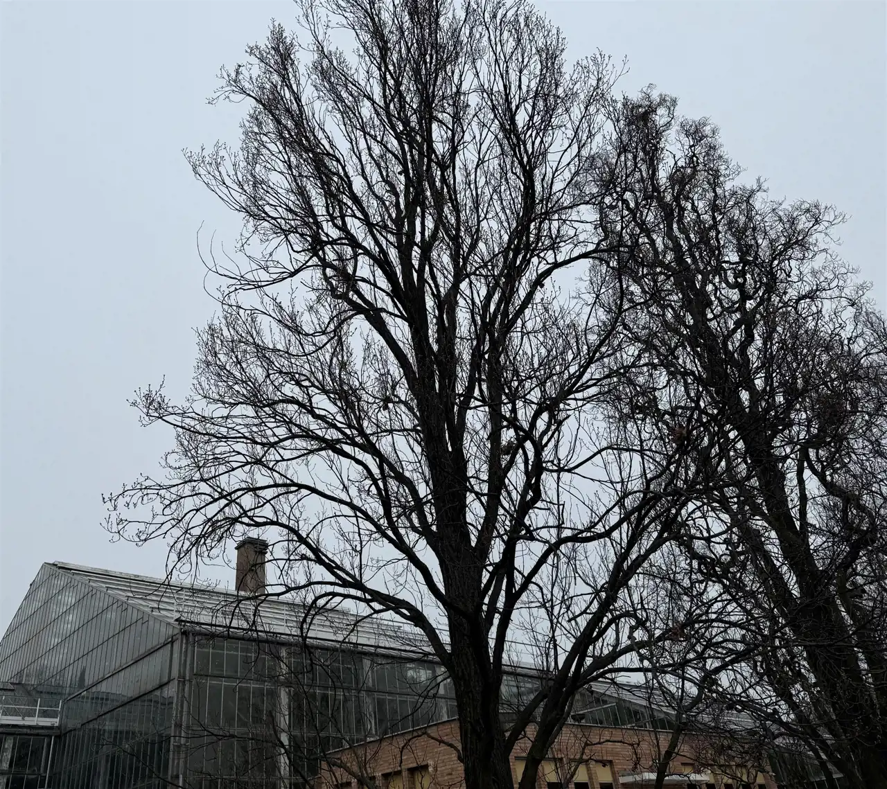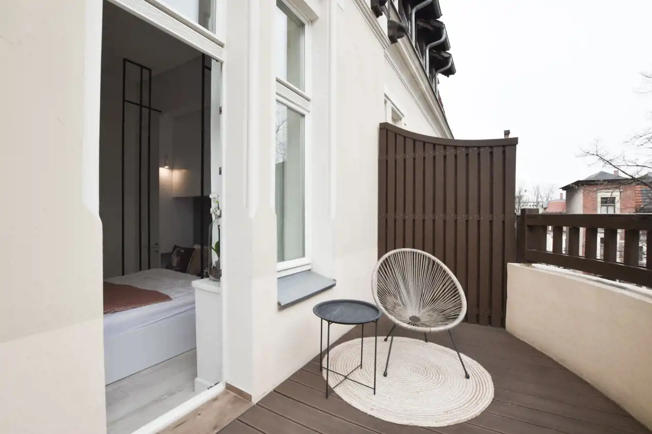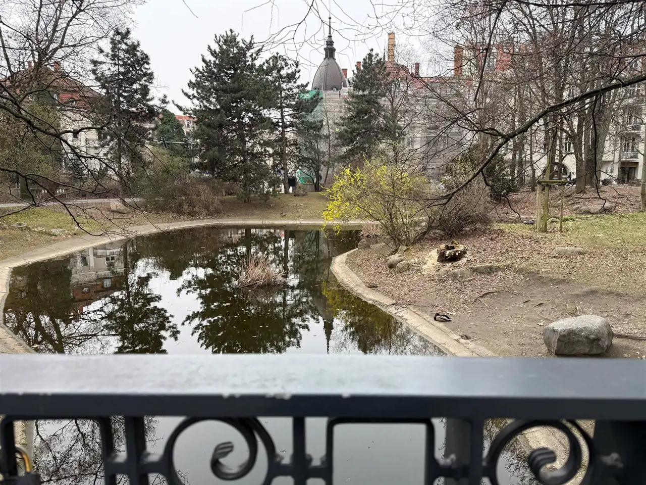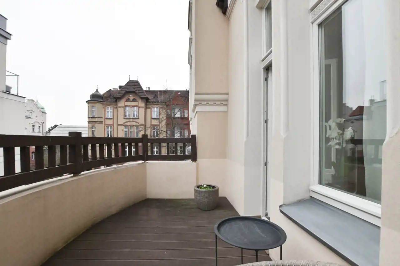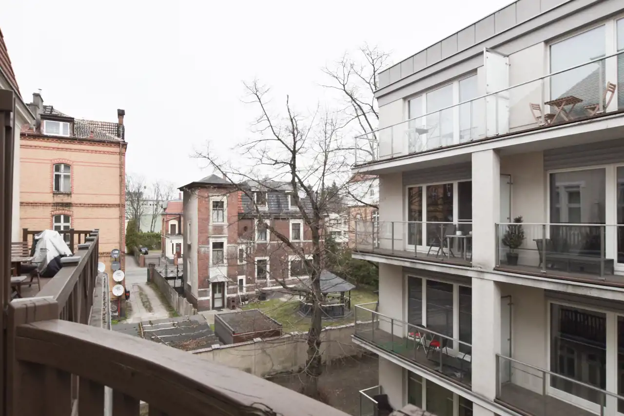 Balkon z widokiem częściowo na dziedziniec, częściowo na poznańską palmiarnię.